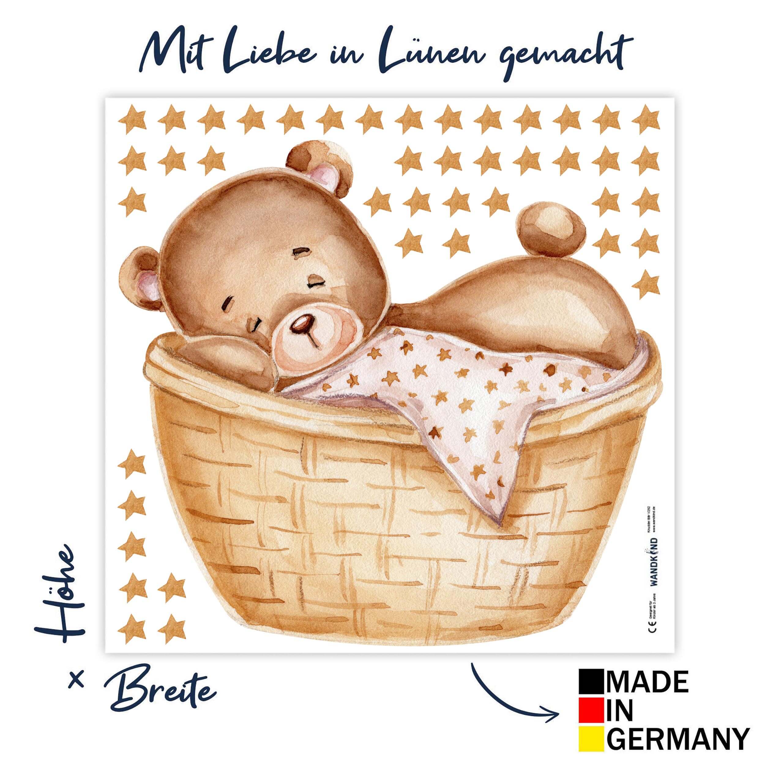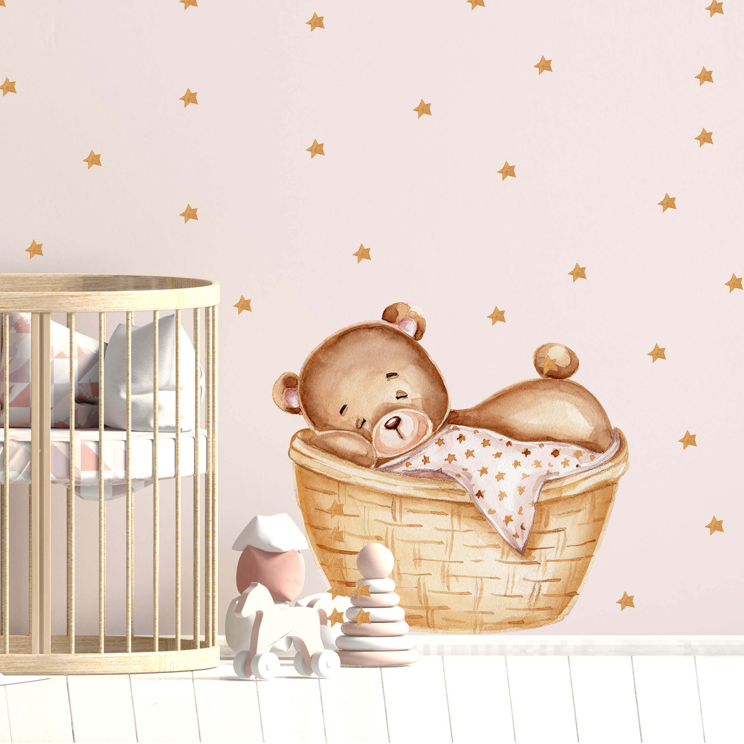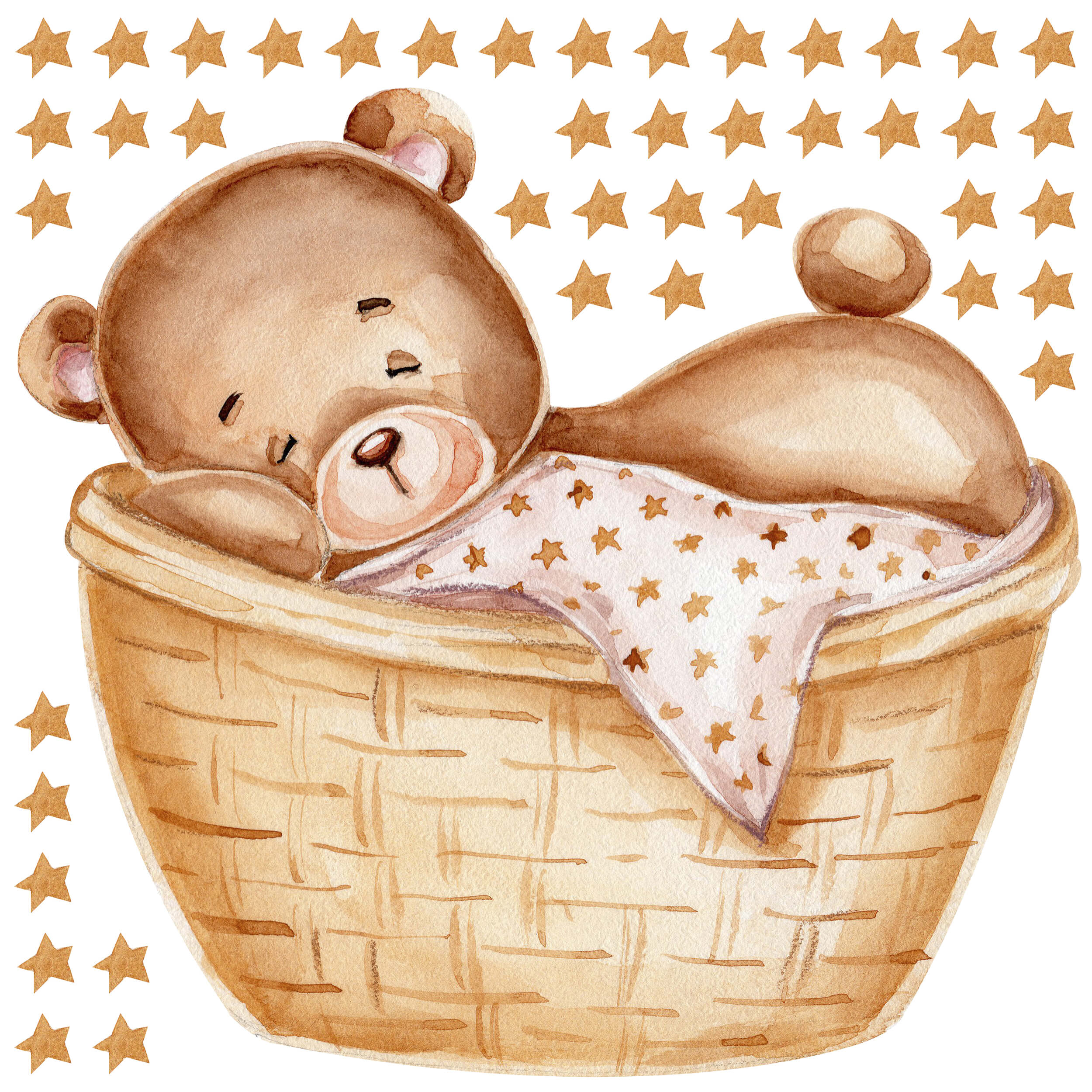 Das Motiv "Sternennacht Bär" zeigt eine Szene, die Gemütlichkeit und Geborgenheit ausstrahlt. Hier sehen wir einen süßen Bären, der friedlich in einem Korb schläft, eingehüllt in eine Sternendecke und umgeben von funkelnden kleinen Sternen.