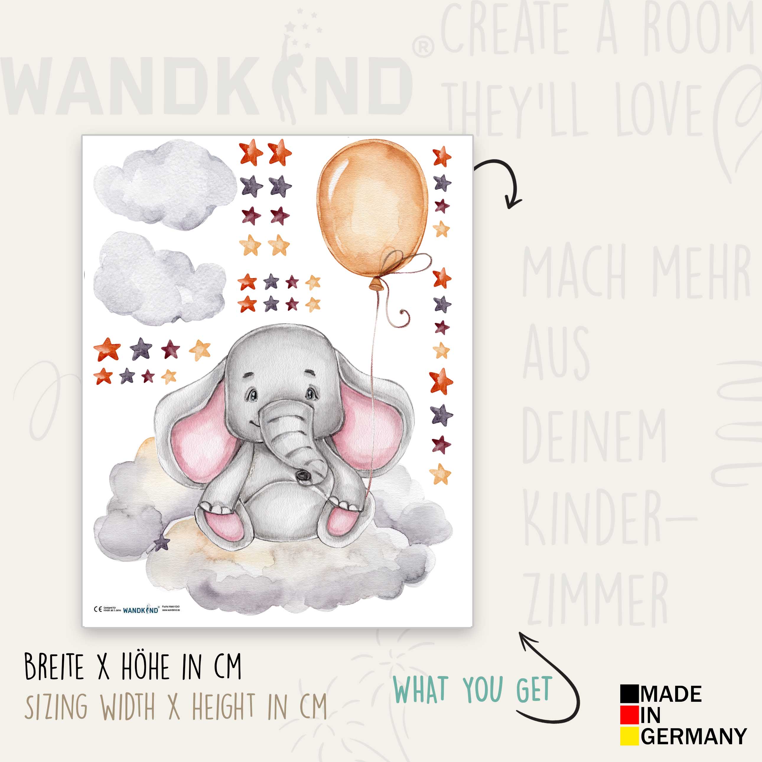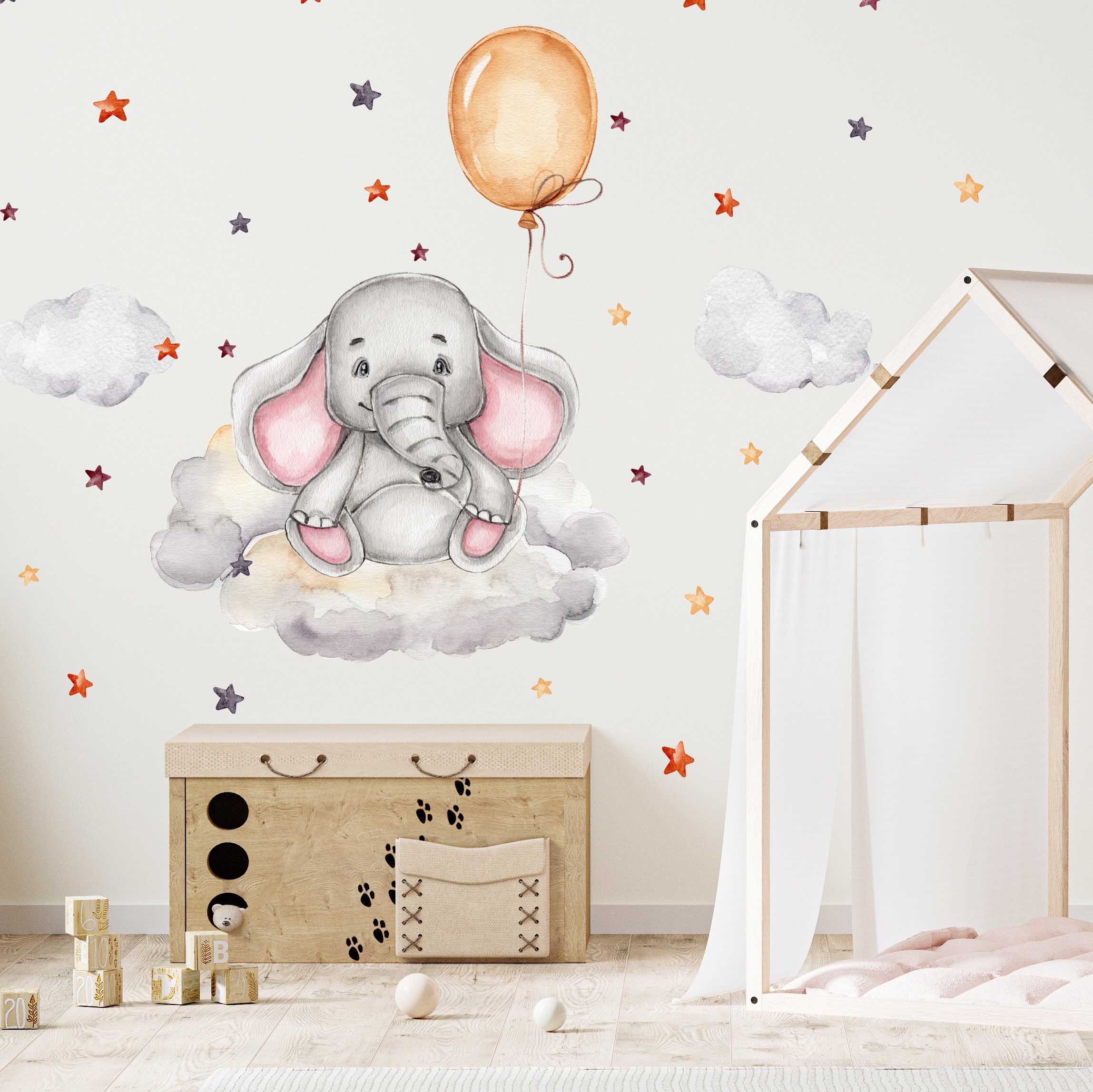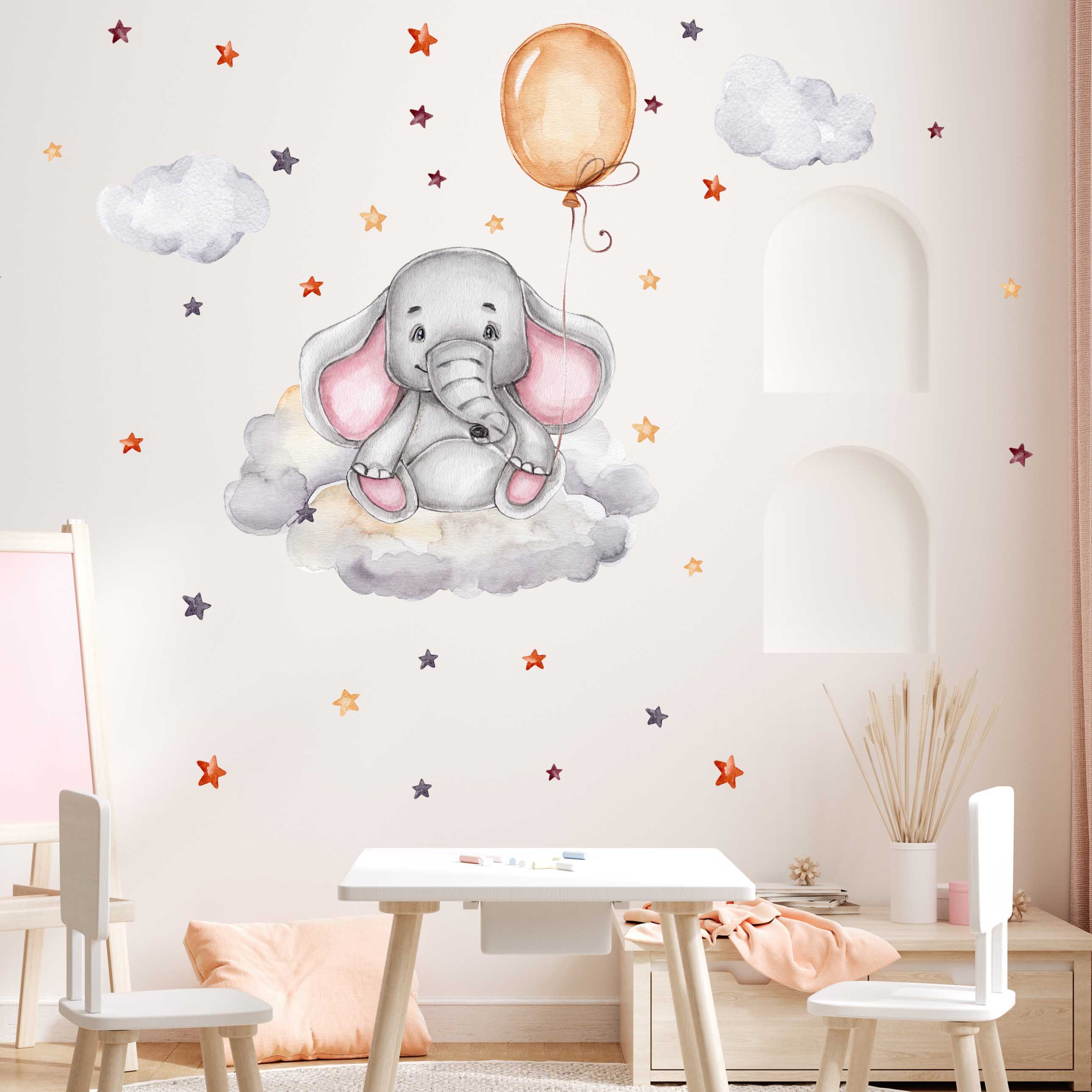 Entdecke die zauberhafte Welt unseres einzigartigen Wandtattoos! Ein fröhlicher Elefant schwebt auf einer flauschigen Wolke und hält einen bunten Ballon fest, während funkelnde Sterne die Szene umrahmen. Dieses bezaubernde Motiv versprüht eine magische Atmosphäre und wird dich und deine Gäste gleichermaßen in Staunen versetzen.DETAILS:
