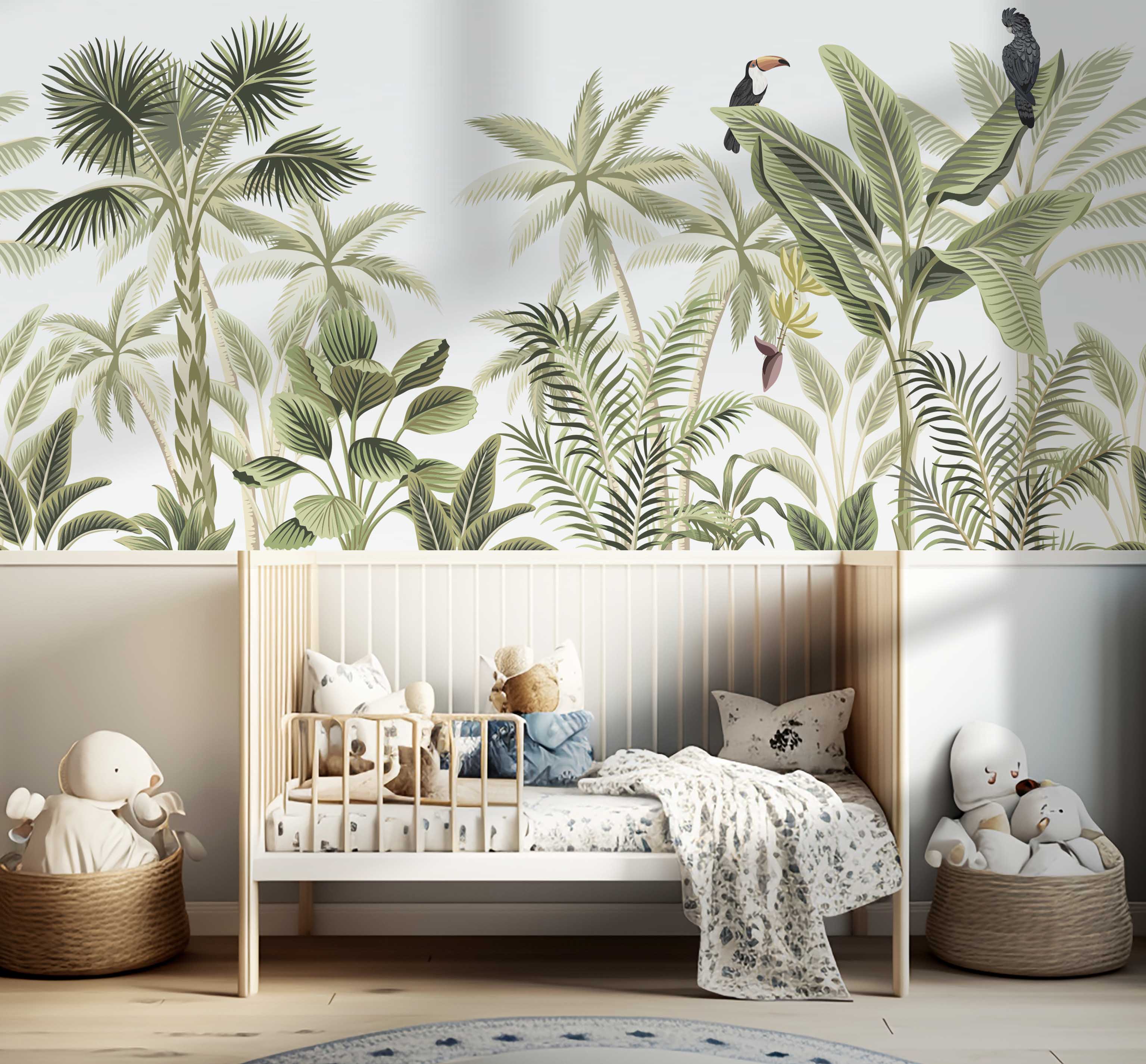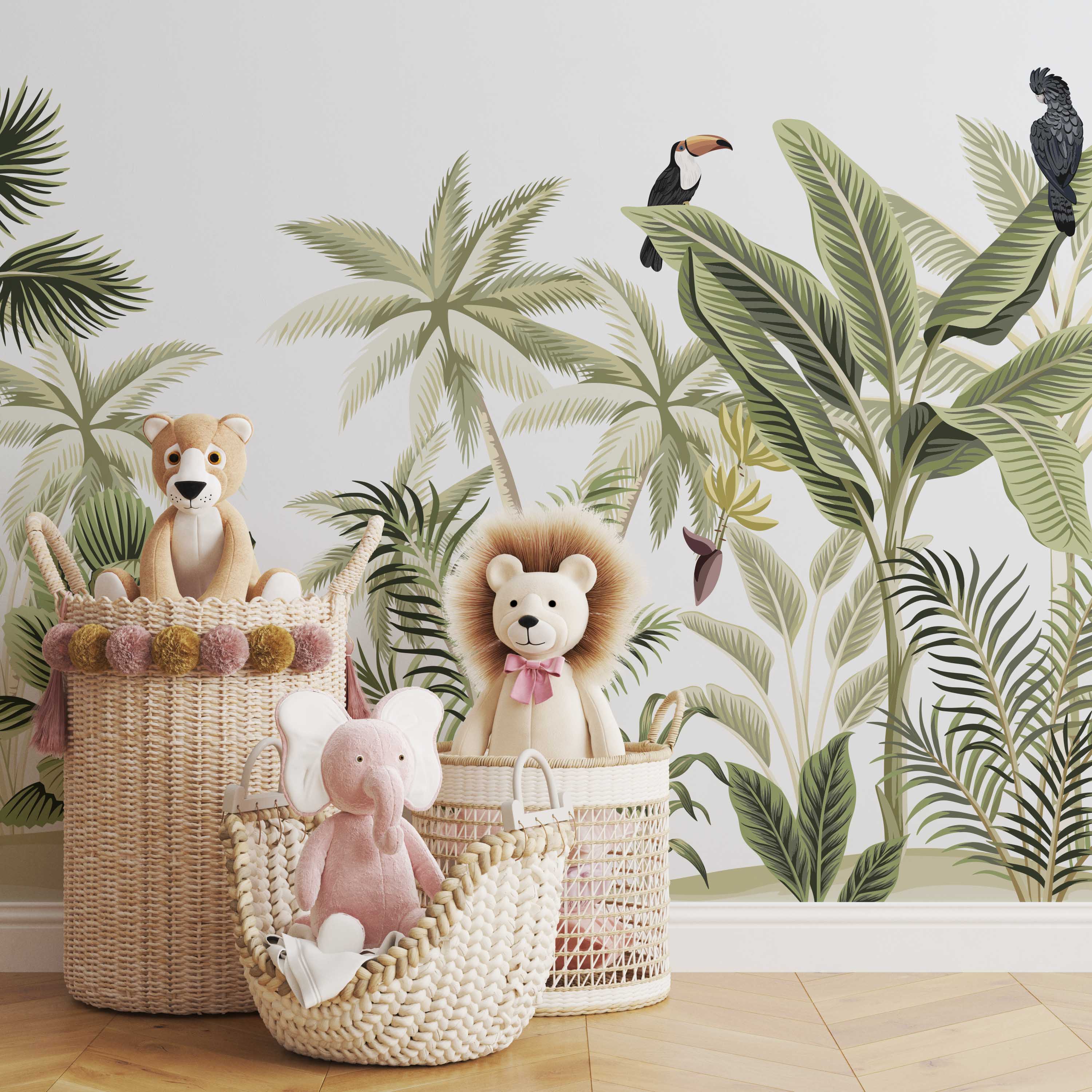 Die Fototapete Dschungel bringt eine farbenfrohe und lebendige Atmosphäre in das Kinderzimmer. Das Motiv zeigt fröhliche Dschungelszenen mit verschiedenen exotischen Pflanzen, Vögeln und kleinen Details, die das Zimmer in eine fantastische Welt verwandeln.
