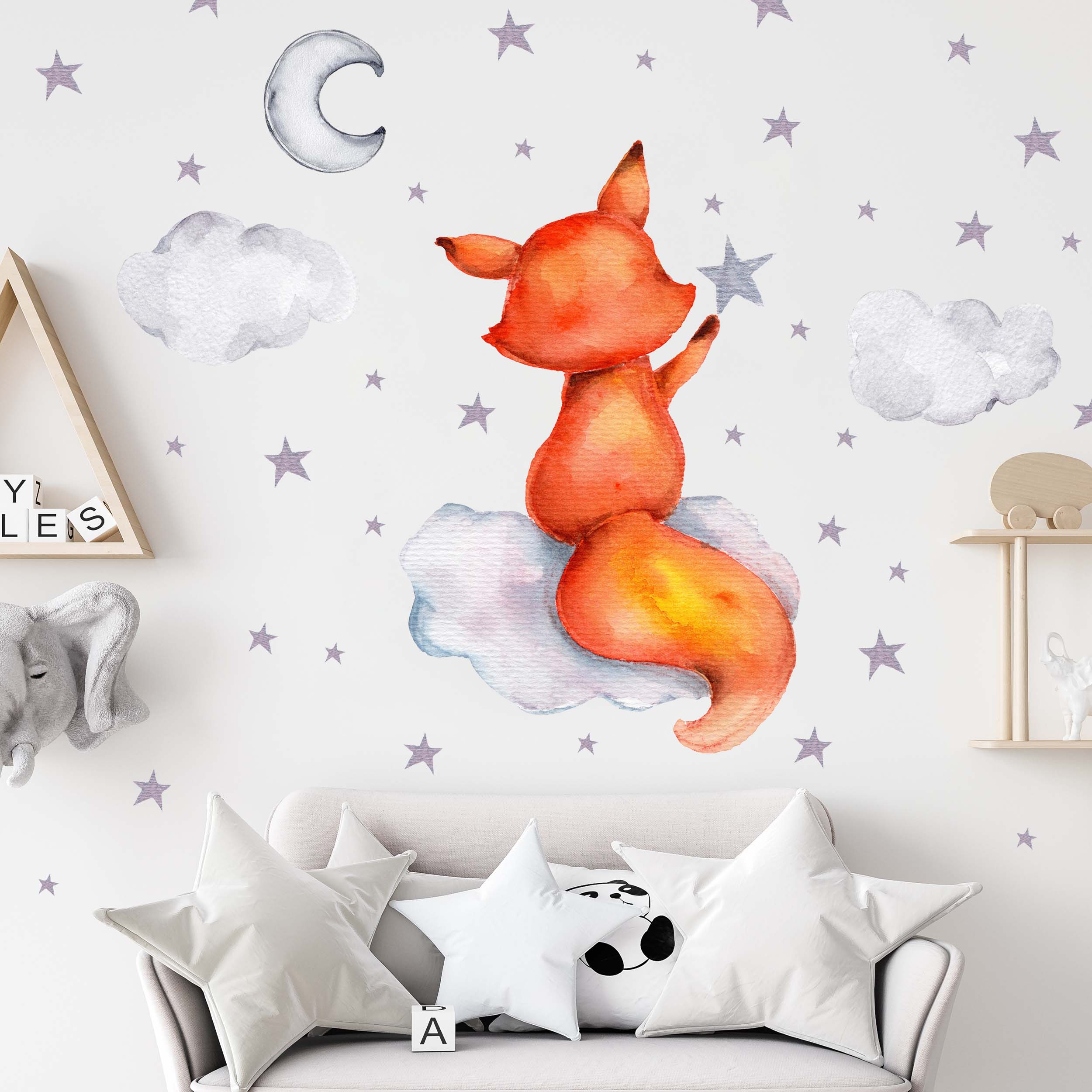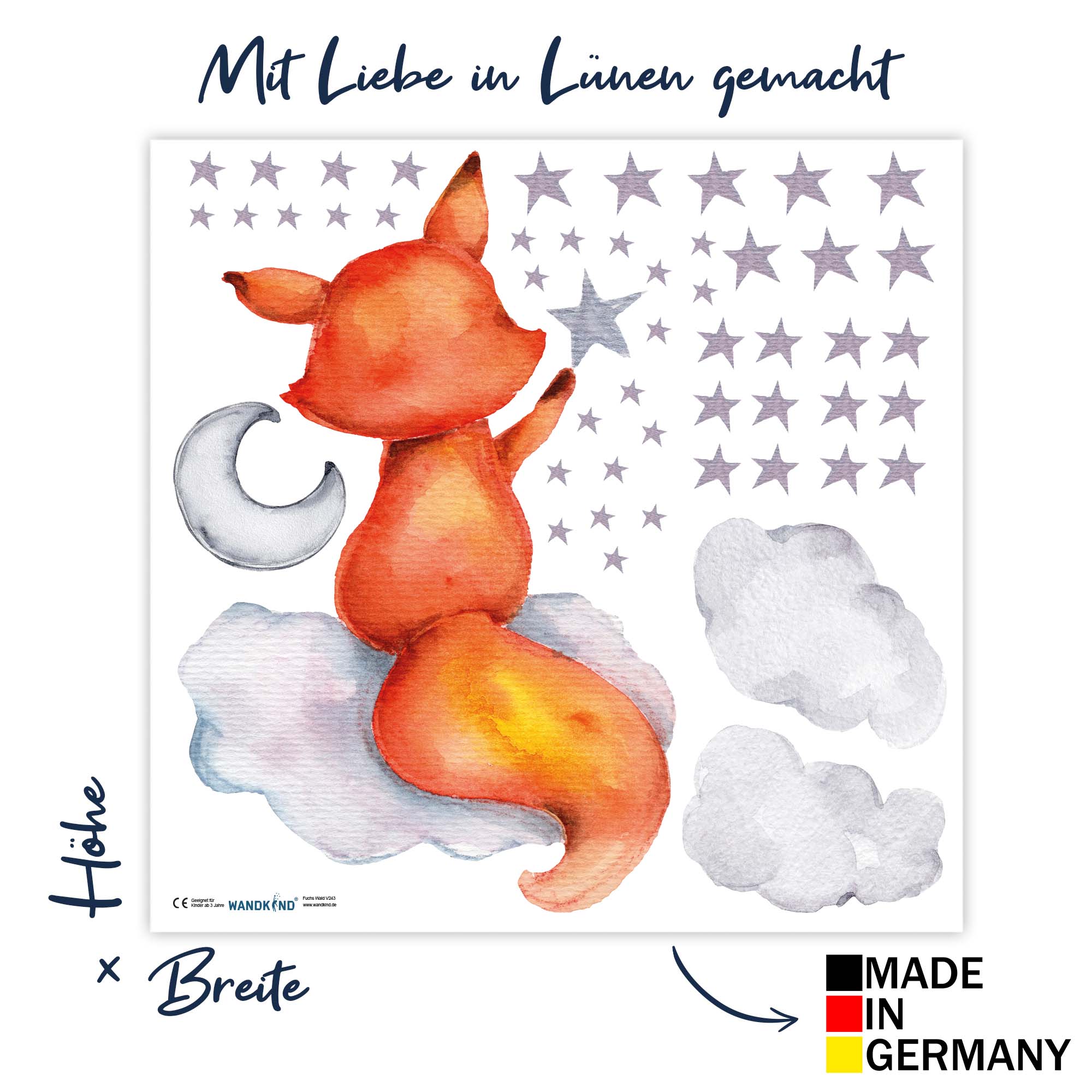 Gemischtes Set aus Fuchs, Wolken und Sterne. Für Sie persönlich hergestellt mit Liebe in Deutschland. Anschmiegsame Vinyl-Qualitätsfolie seidenmatte Oberfläche einzigartige Designs für jeden Raum schöne Wände sind schnell realisierbar Raufaser & rückstandsfrei entfernbar selbst gestalten & handgezeichnet Made with love in Germany