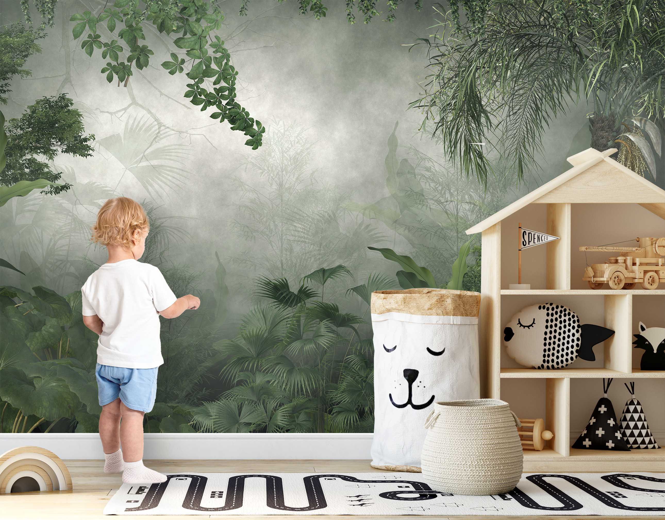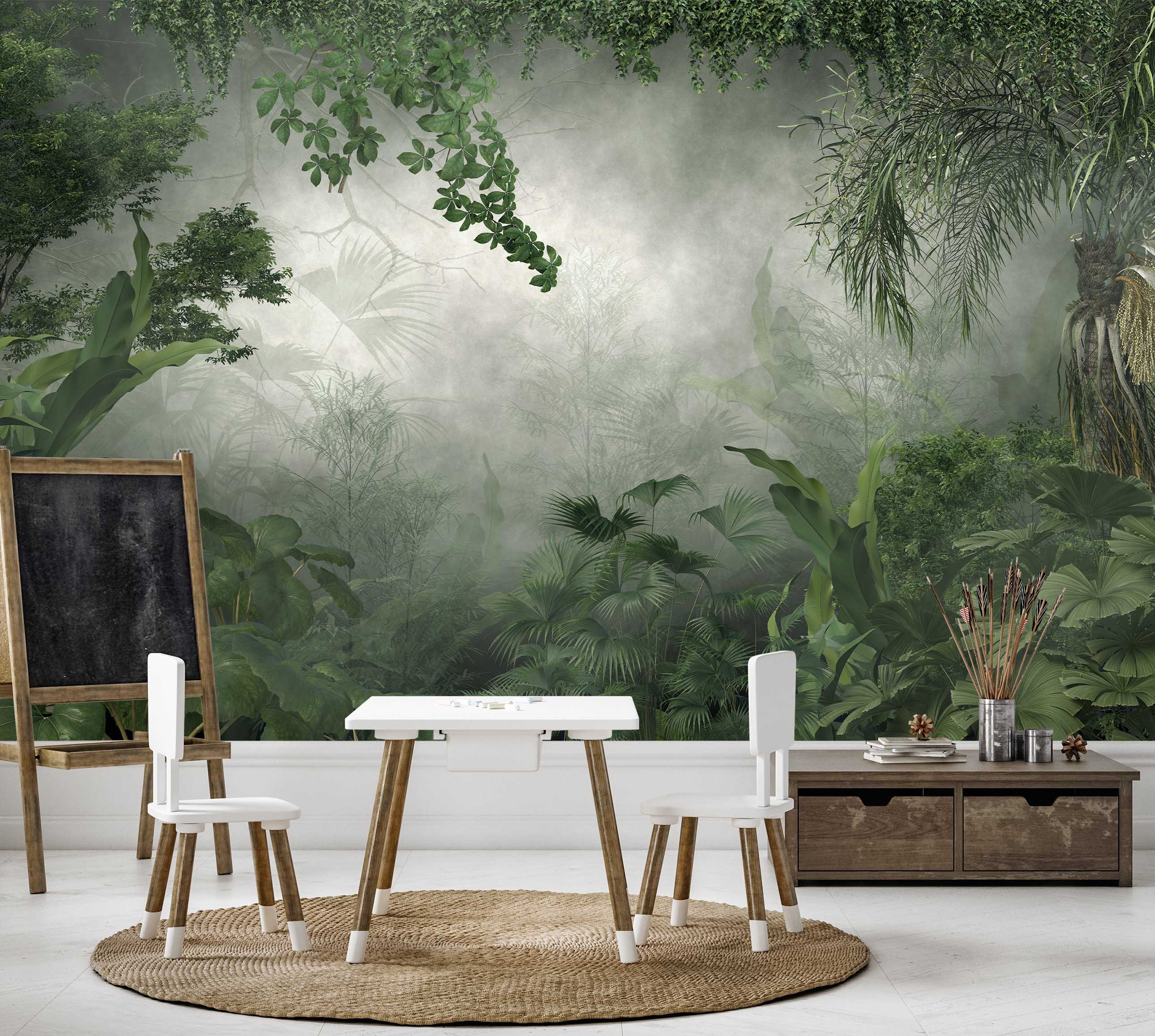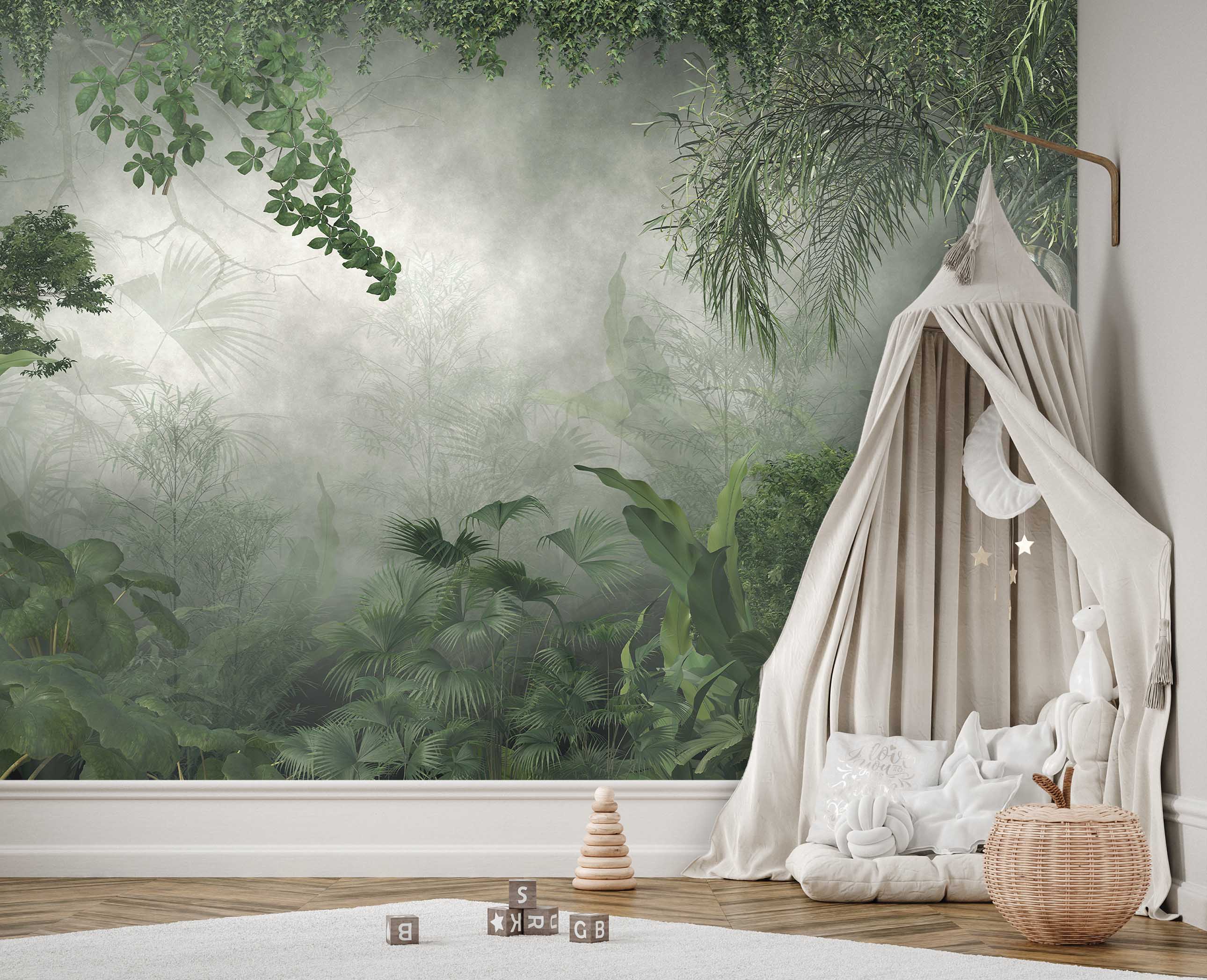 Betritt eine Welt des Geheimnisses mit unserer verblüffenden Wandgestaltung eines nebeligen Waldes