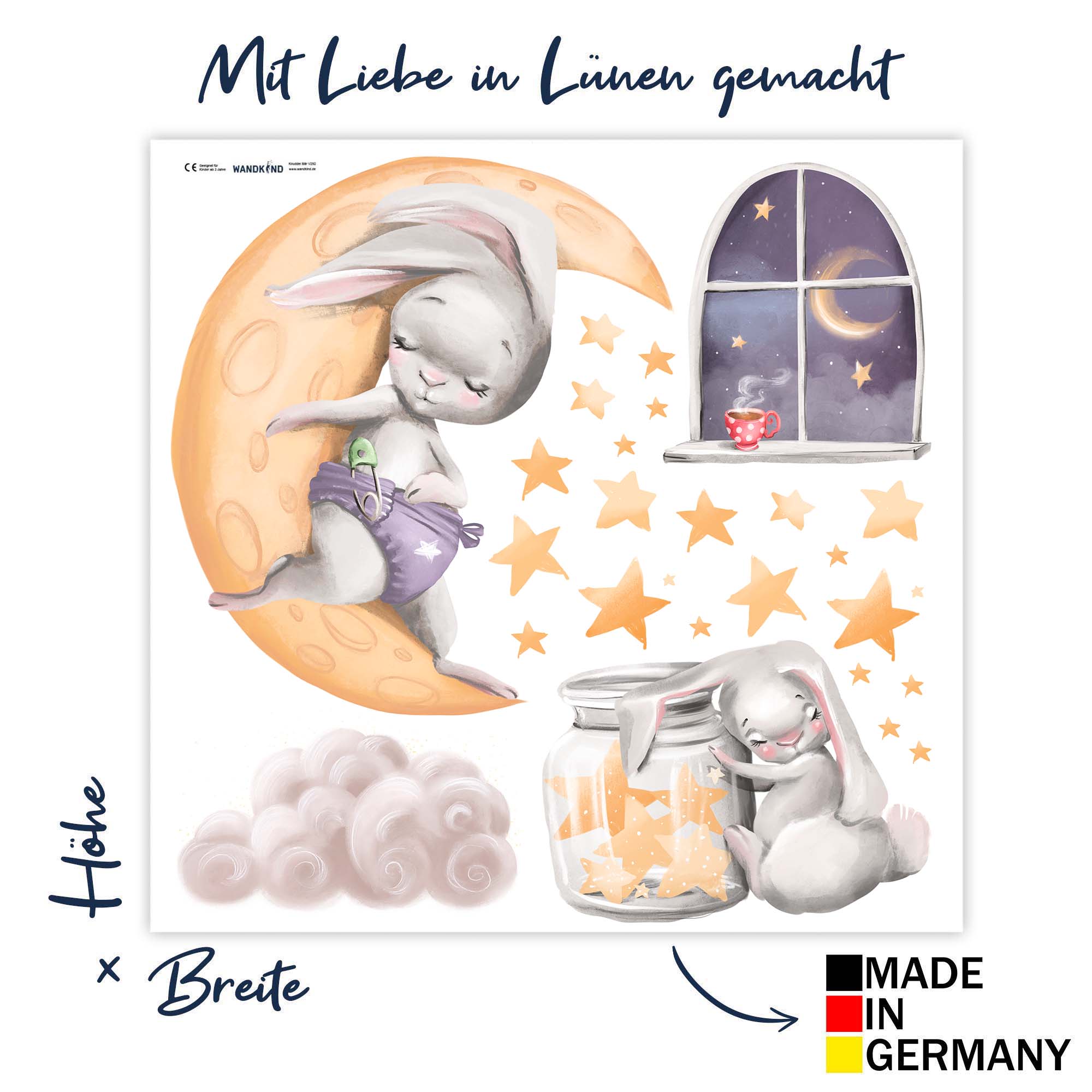 Gemischtes Set aus einem zwei Hasen, Mond und Sterne. Für Sie persönlich hergestellt mit Liebe in Deutschland anschmiegsame Vinyl-Qualitätsfolie seidenmatte Oberfläche einzigartige Designs für jeden Raum