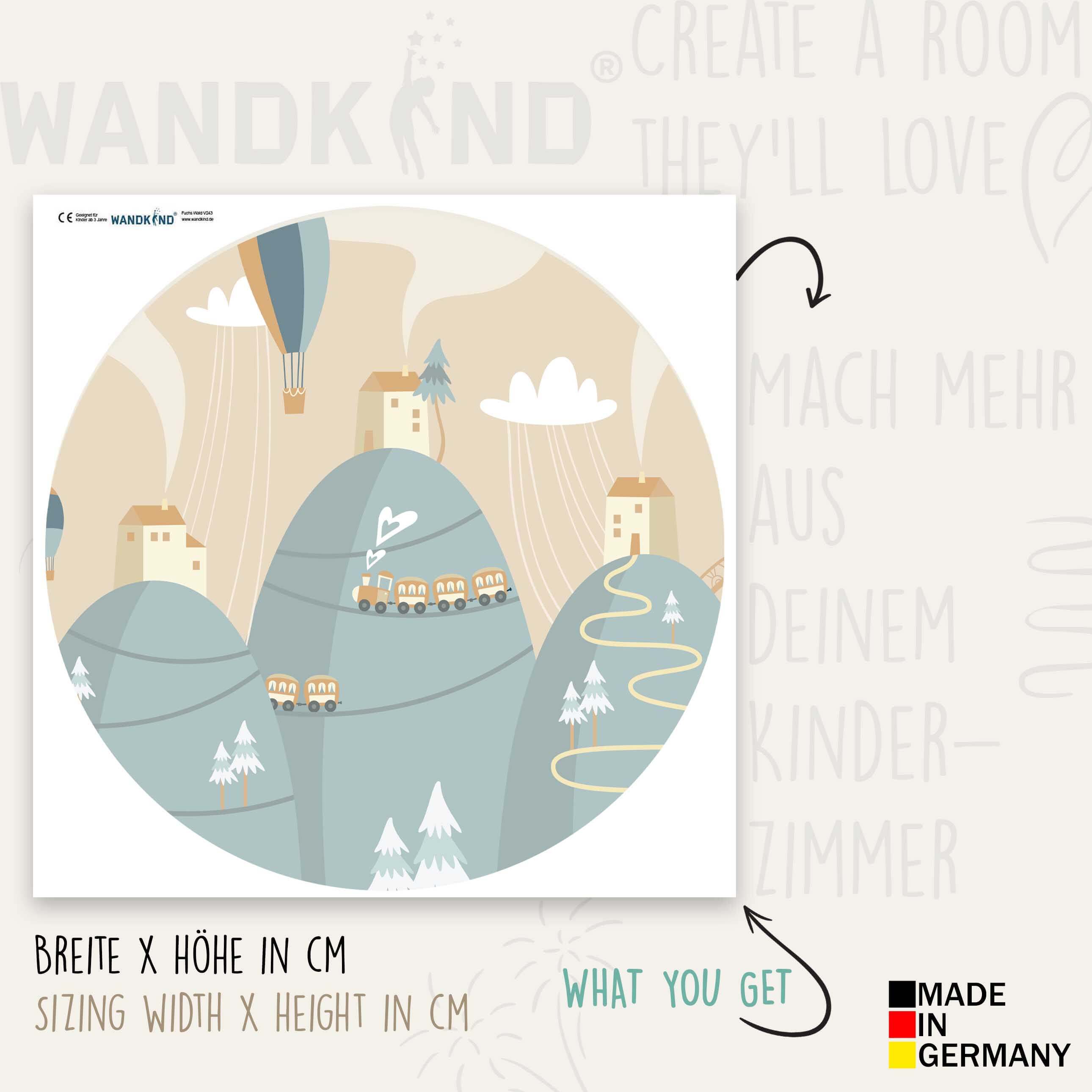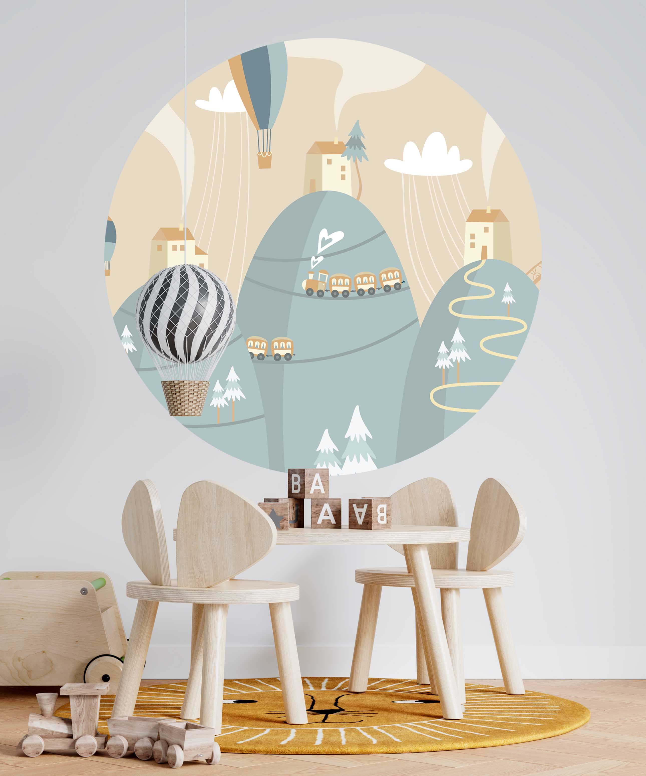 Durch die Verwendung heller Farben und nicht-realistischer Darstellungen erhält das Motiv eine spielerische, fast märchenhafte Ästhetik. Die hellen Töne und einfachen Formen tragen dazu bei, eine fröhliche und unbeschwerte Atmosphäre zu erzeugen, die sich perfekt für das Kinderzimmer oder den Spielbereich eignet.