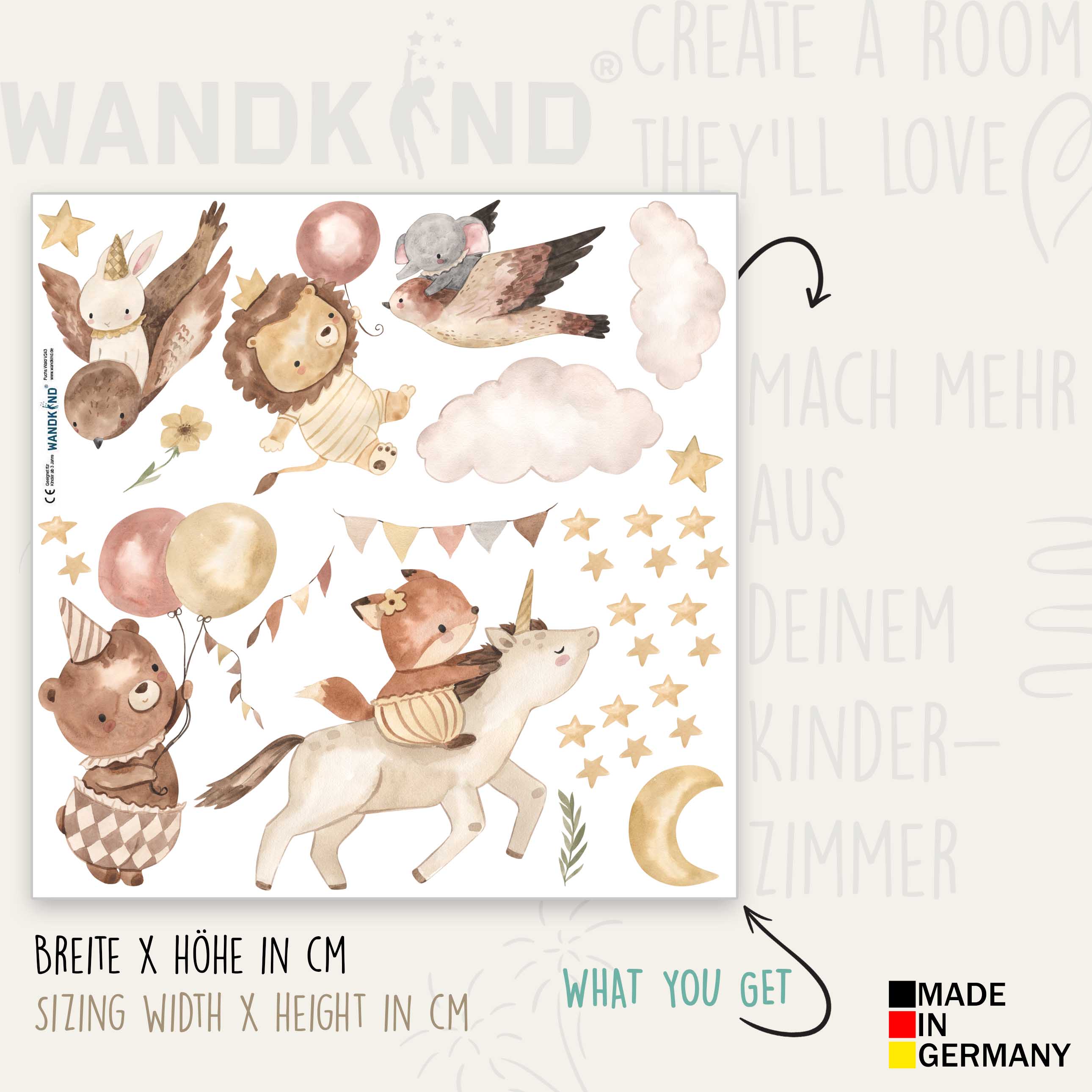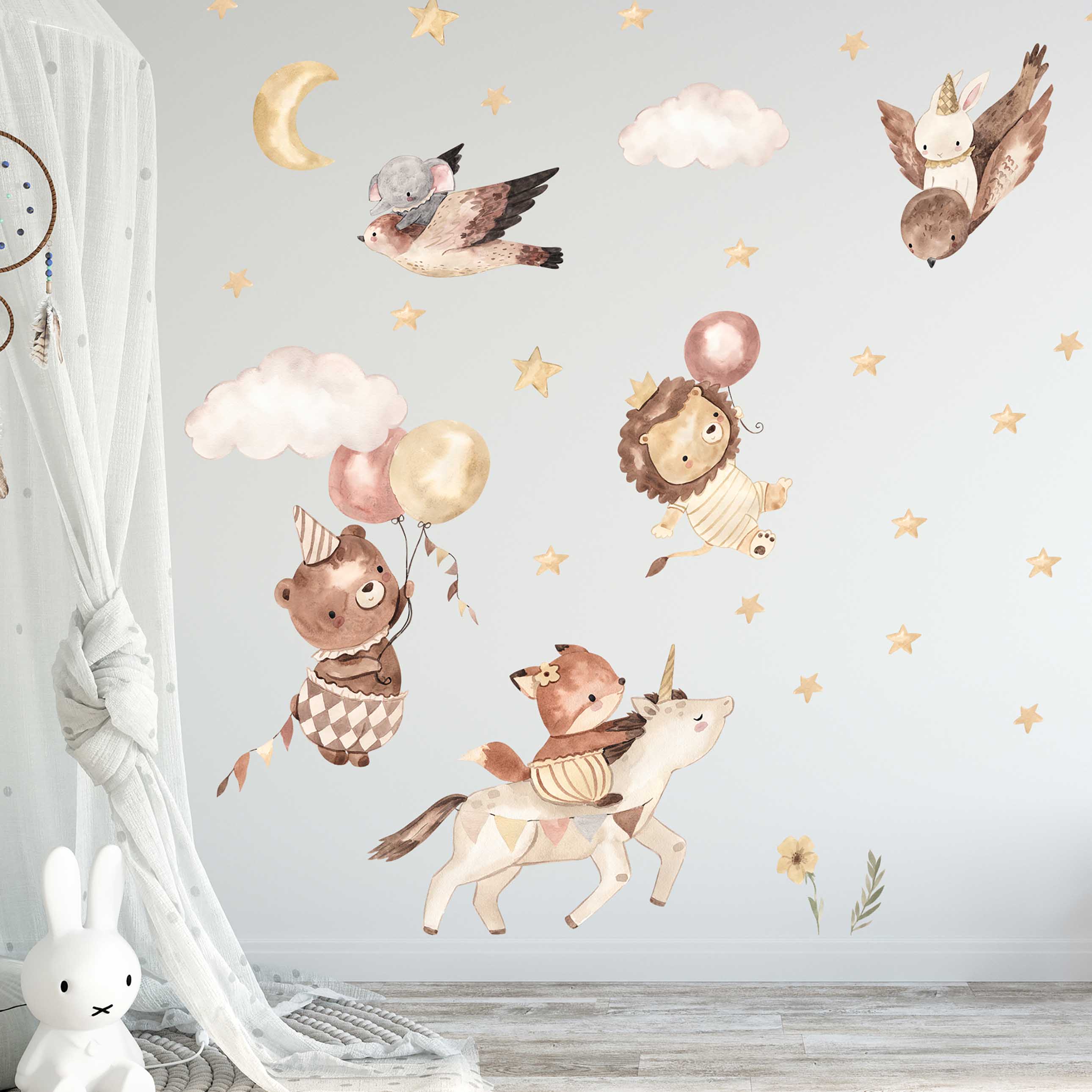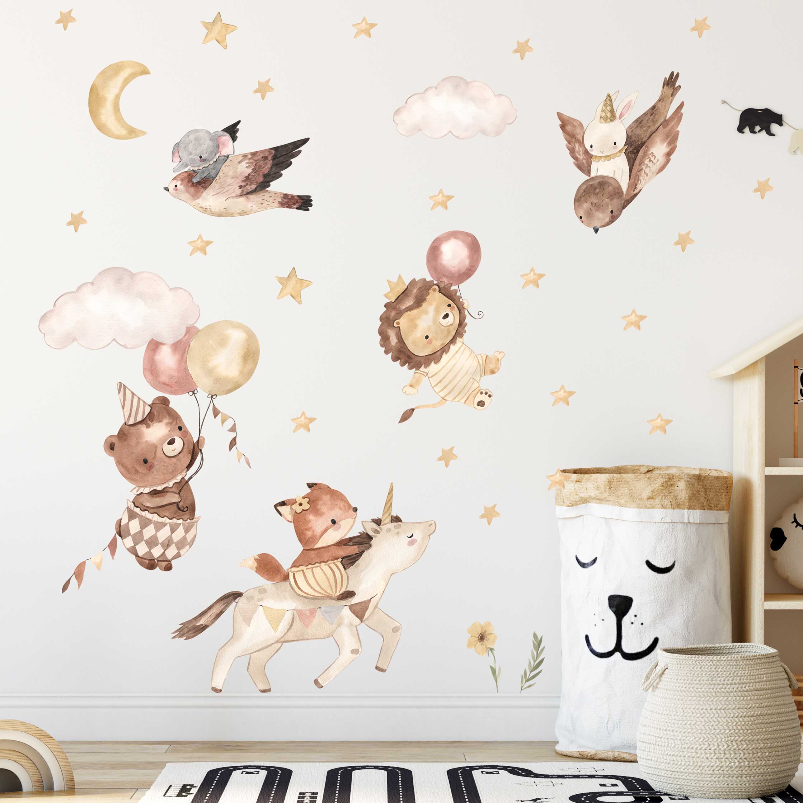 Das charmante Motiv nimmt uns mit auf eine märchenhafte Reise über den nachthimmel. Hier sieht man eine faszinierende Szene von Safari-Tieren - ein Löwe, der von einem Luftballon emporgehoben wird, ein Bär, der von zwei Ballons hochgetragen wird, ein Fuchs, der von einem Einhorn begleitet wird, und in der Luft ein Vogel, der einen kleinen Elefanten trägt. Sie alle schweben in einem Himmel voller gelber Sterne, begleitet von einem strahlenden Mond und flauschigen Wolken.