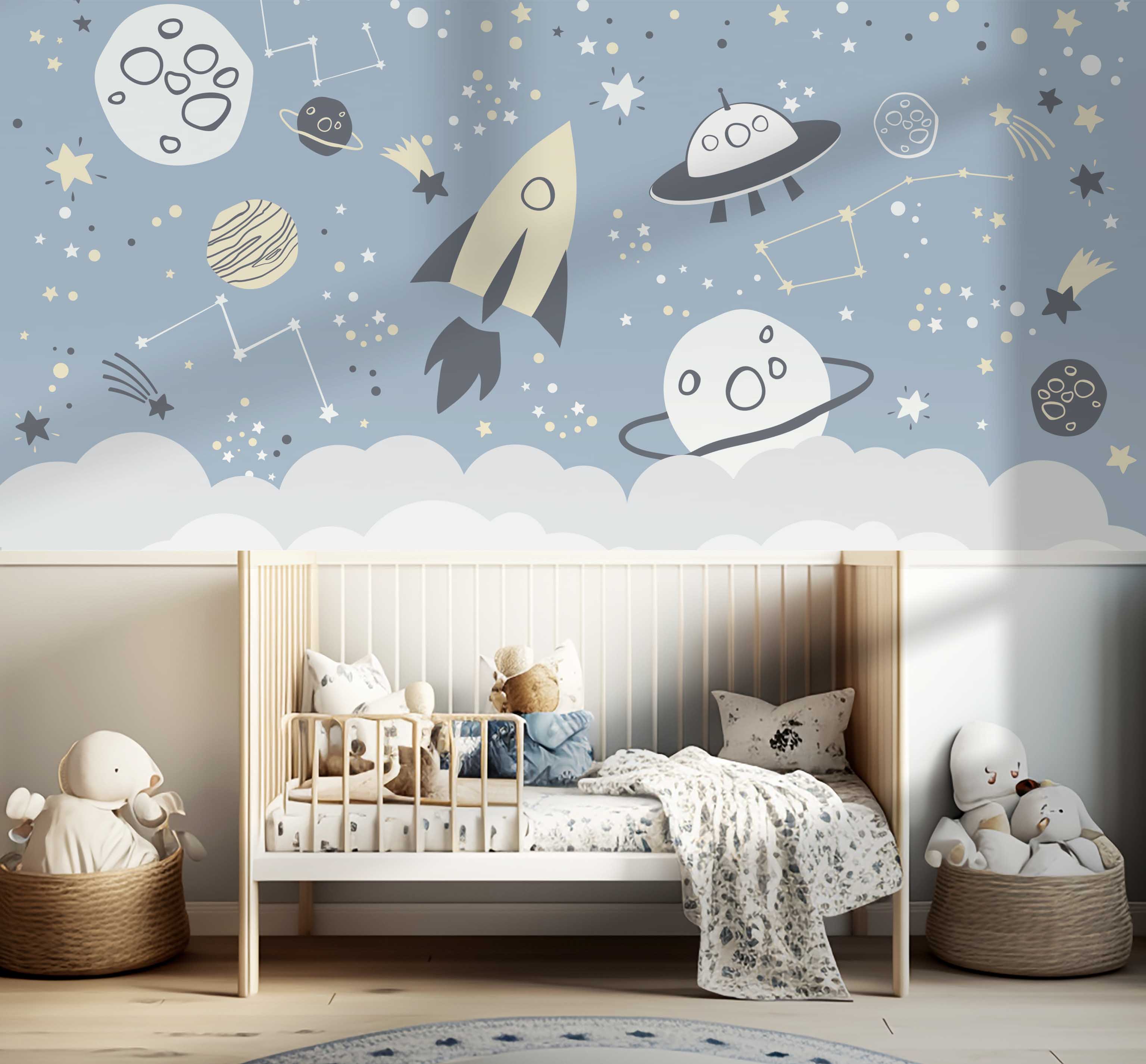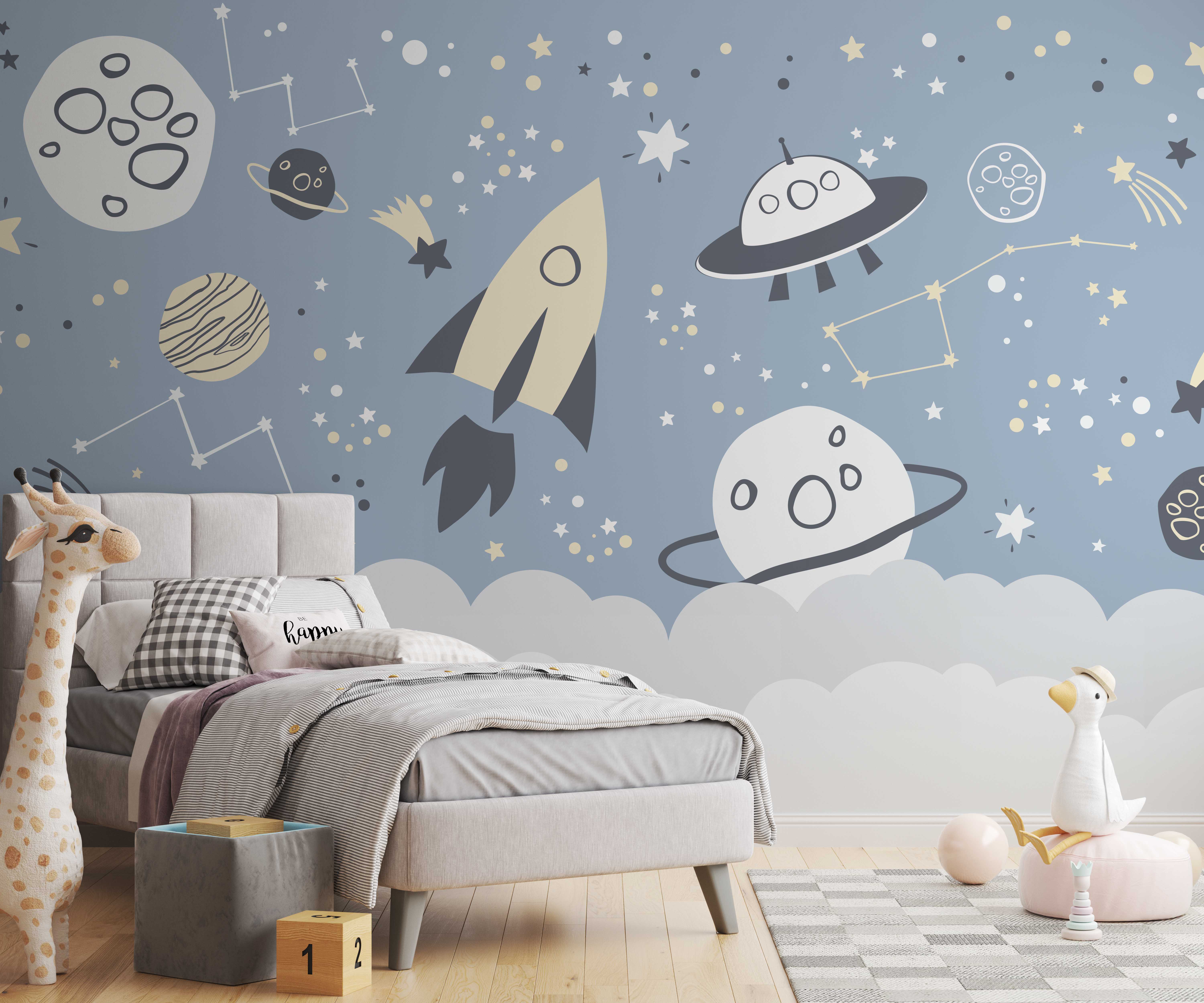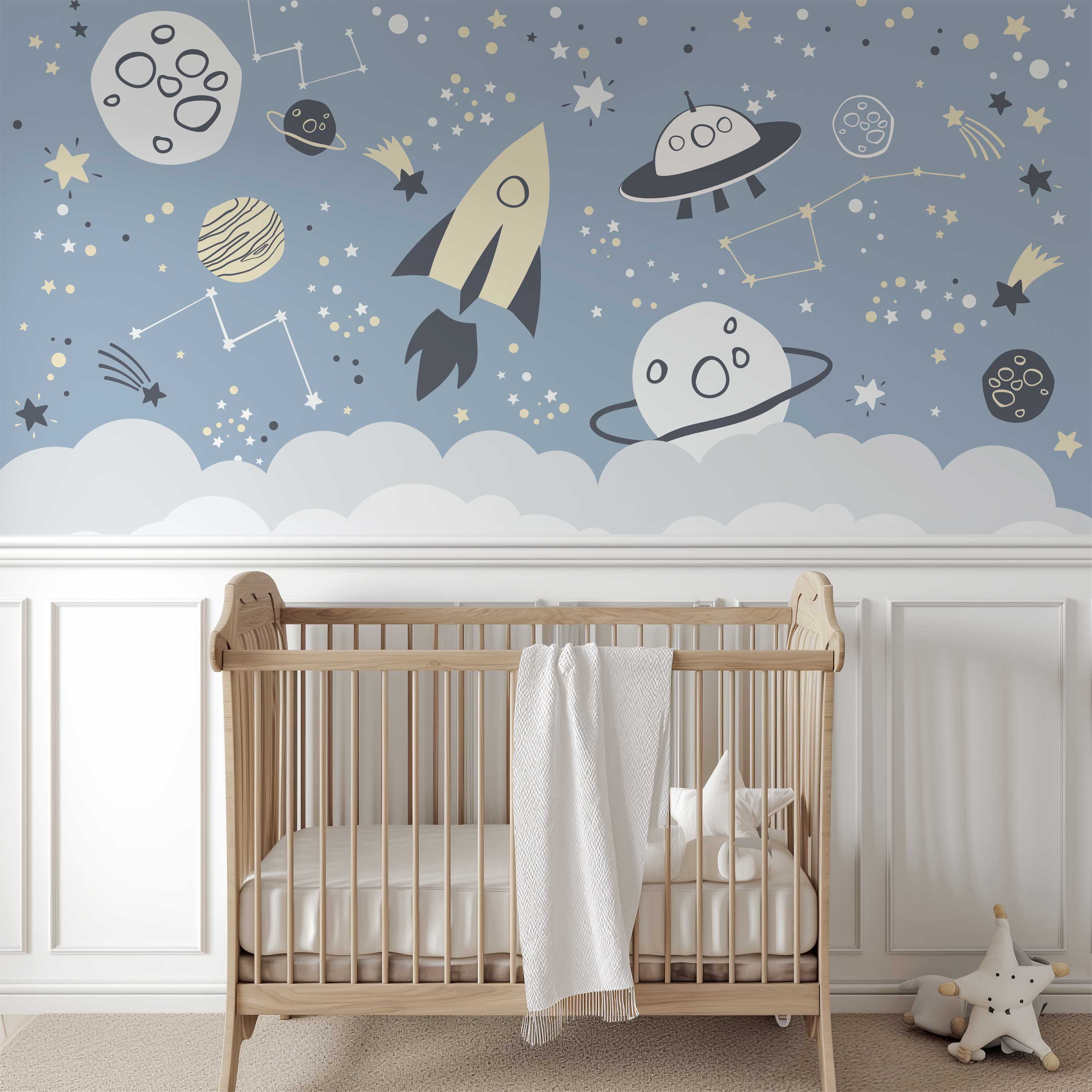 Erkunde die unendlichen Weiten des Weltalls - mit unserer faszinierenden Weltraum-Tapete in einem sanften hellblauen Hintergrund!