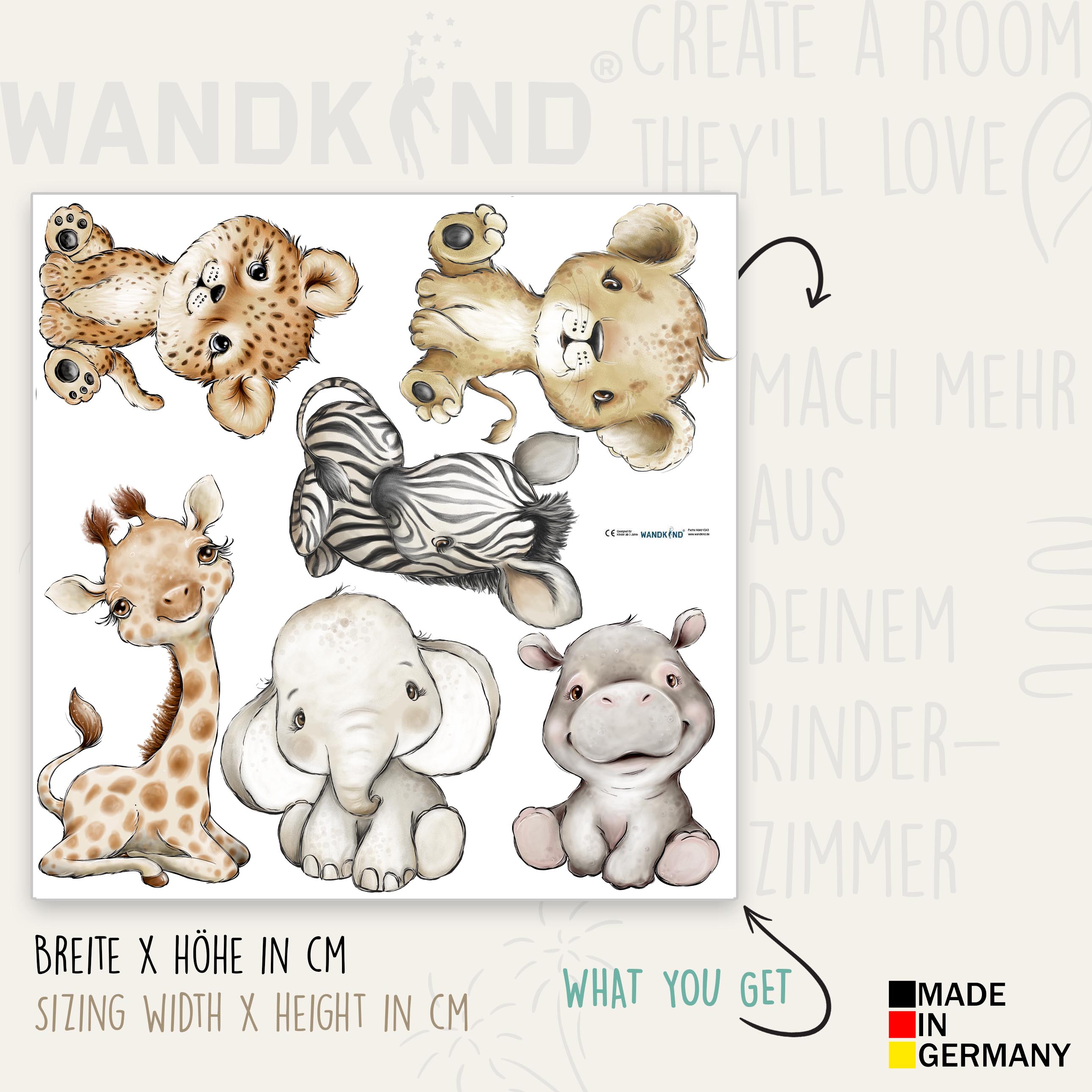 Tauche ein in die faszinierende Savanne und entdecke eine bezaubernde Welt der Tiere. Hier sitzen die süßen Babyversionen von Giraffe, Tiger, Elefant, Nilpferd, Löwe und Zebra versammelt und verbreiten eine ansteckende Freude.DETAILS: