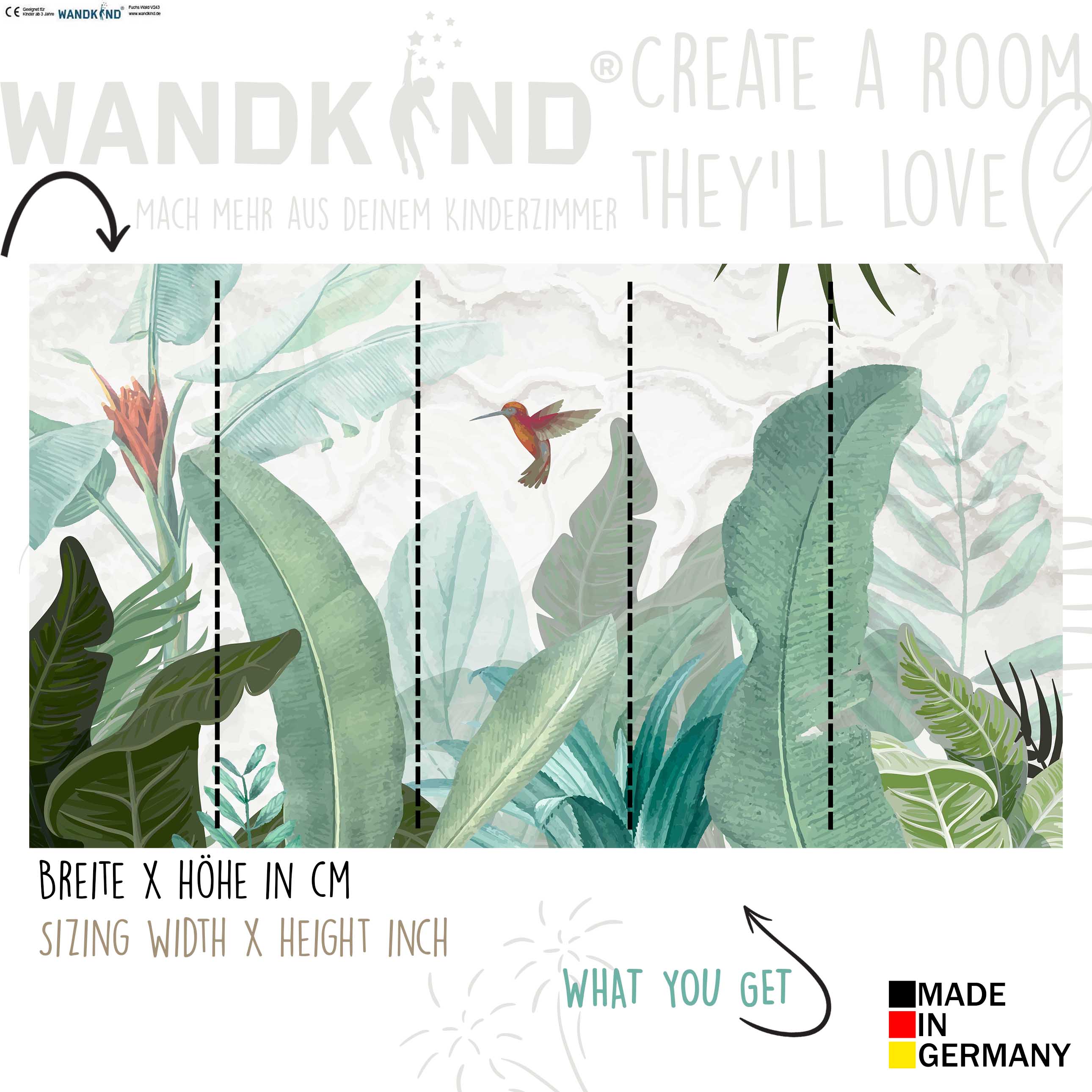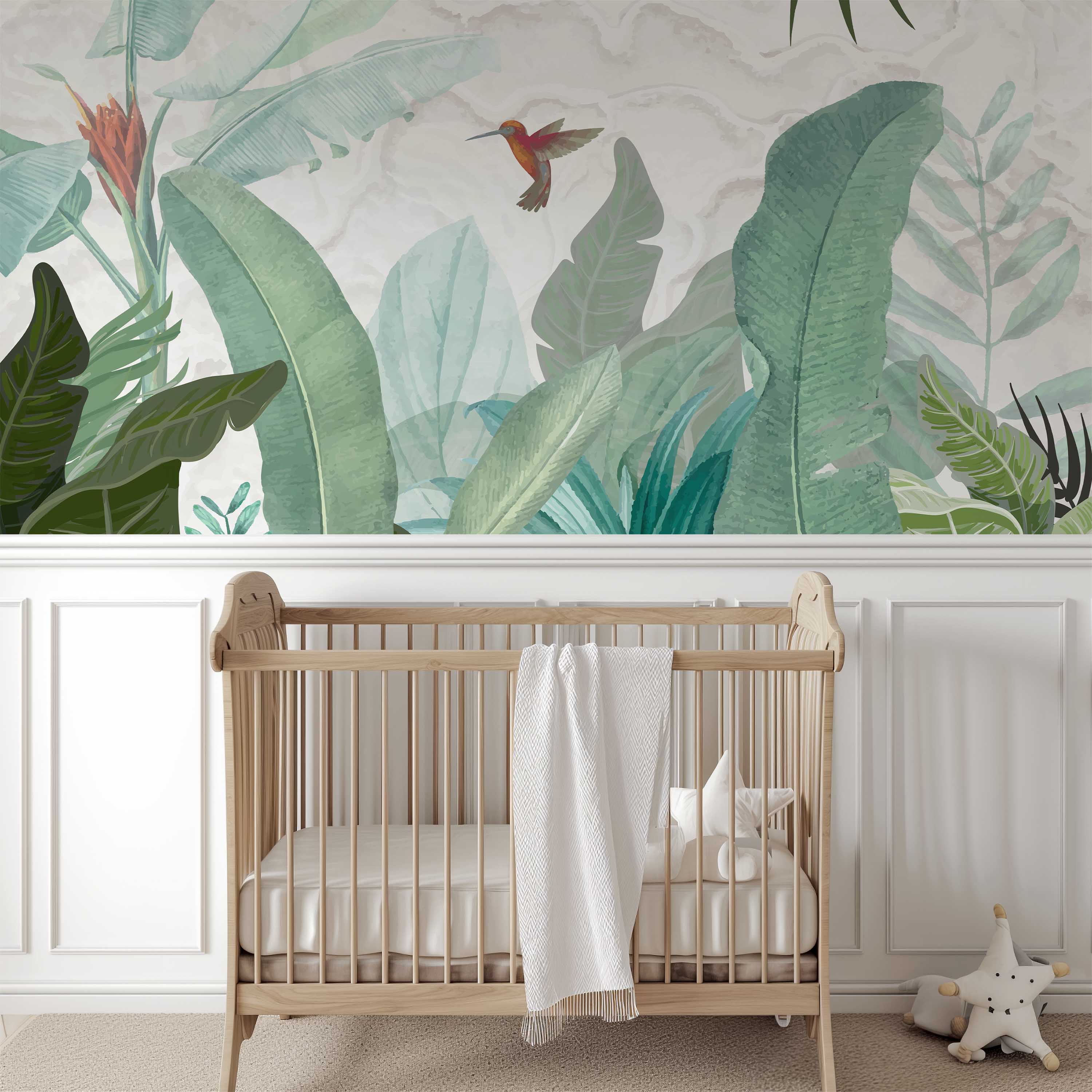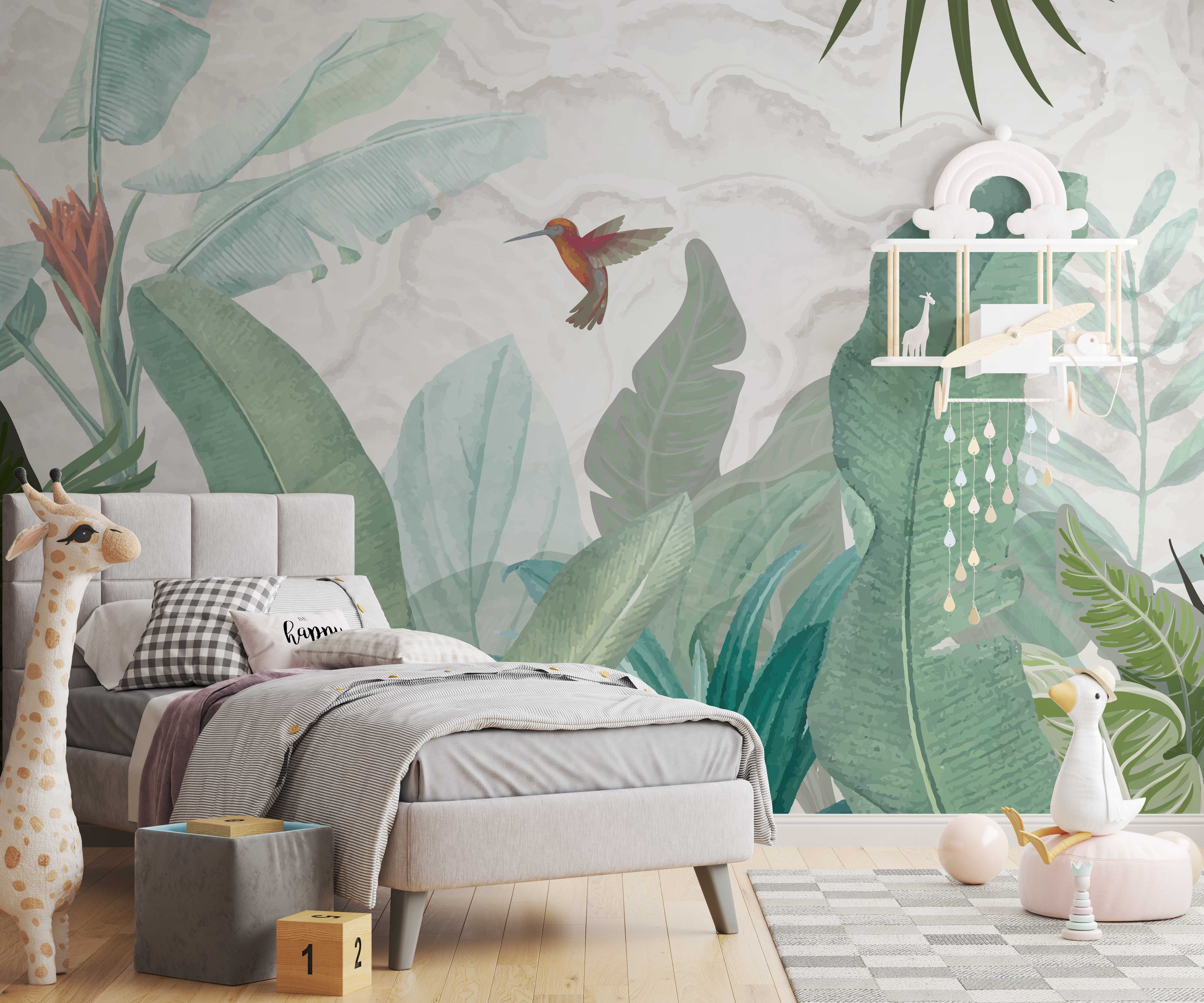 Die Fototapete Tropische Blätter bringt eine lebendige und erfrischende Atmosphäre in deine Räumlichkeiten. Das Motiv zeigt detailreiche tropische Blätter und Pflanzen in satten Grüntönen, durchsetzt mit einem farbenfrohen Kolibri, der eine harmonische und exotische Szenerie schafft. Die intensiven Farben und die kunstvollen Illustrationen verleihen dem Raum eine natürliche und zugleich beruhigende Optik.