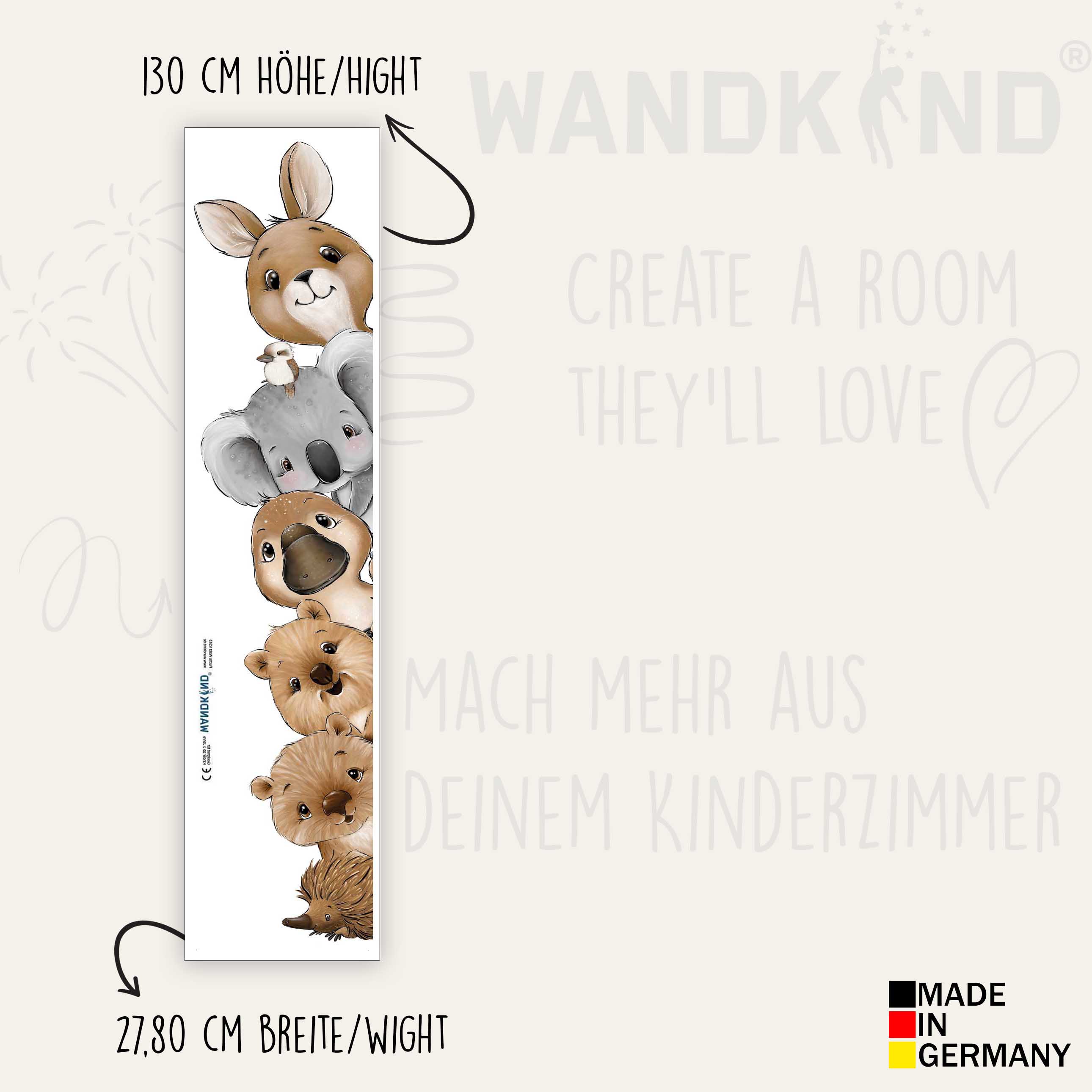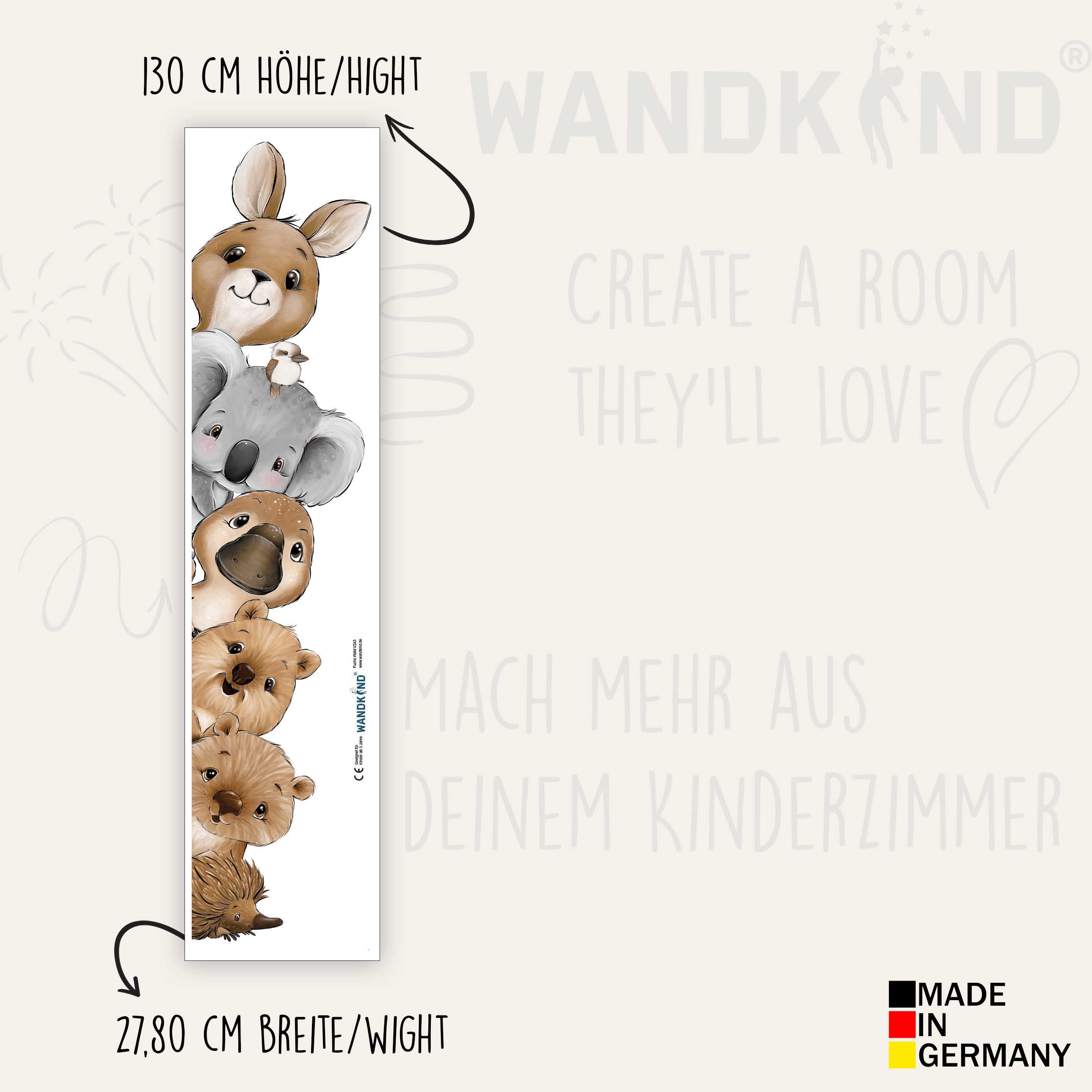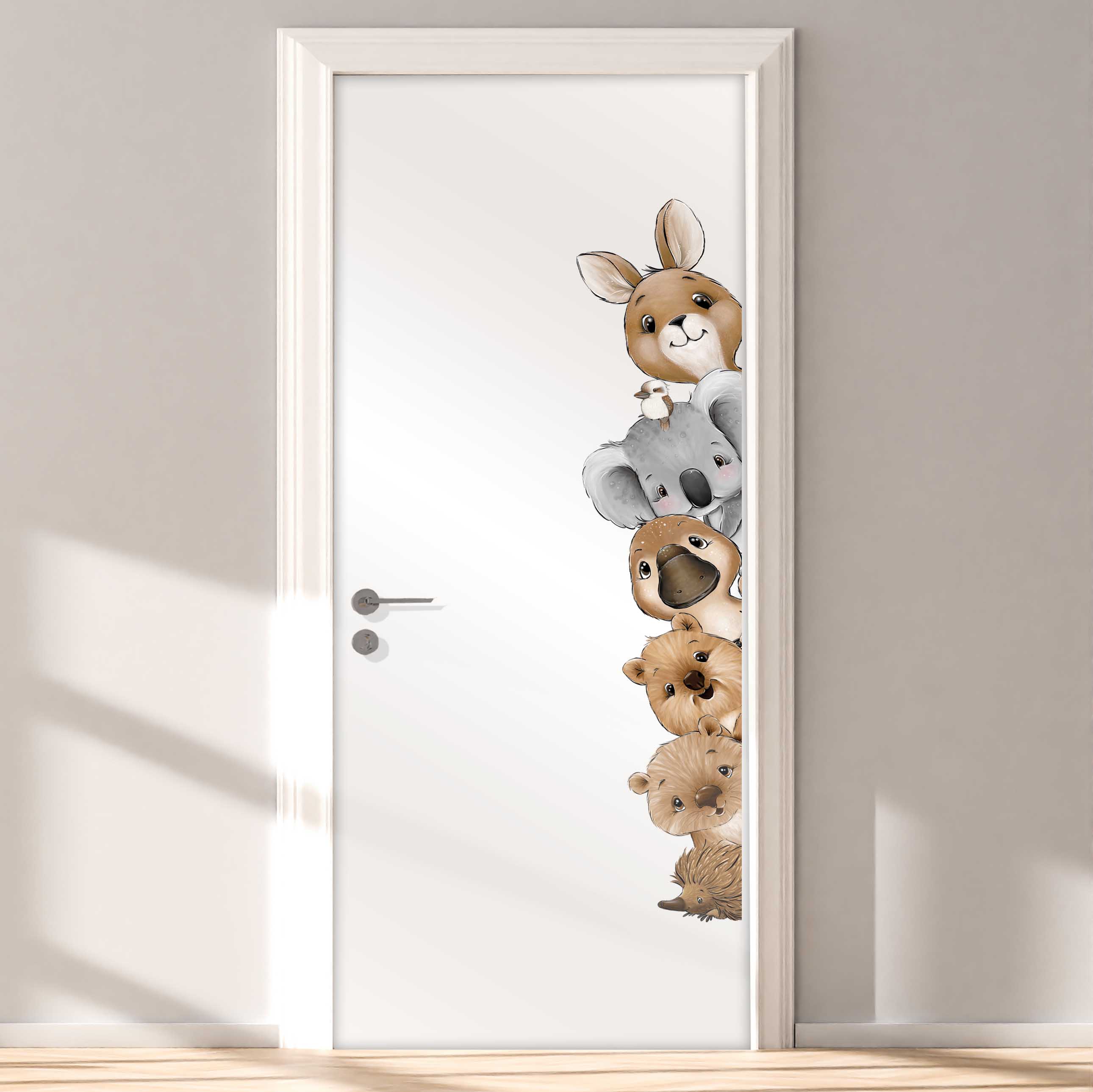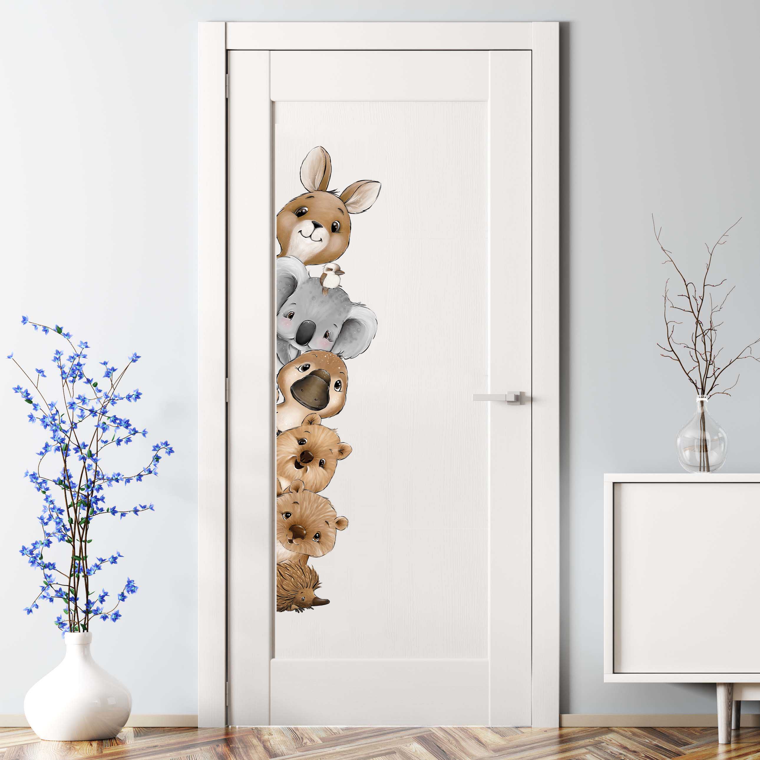 Begrüßen Sie den Tag mit unserem lustigen und liebevoll gestalteten Türkleber, der eine verspielte Szene aus dem Tierreich darstellt. Ein Hase, ein Koala, eine Ente, ein Otter und ein Igel scheinen freudig um die Ecke Ihrer Tür zu schauen und schaffen eine herzliche und einladende Atmosphäre.
