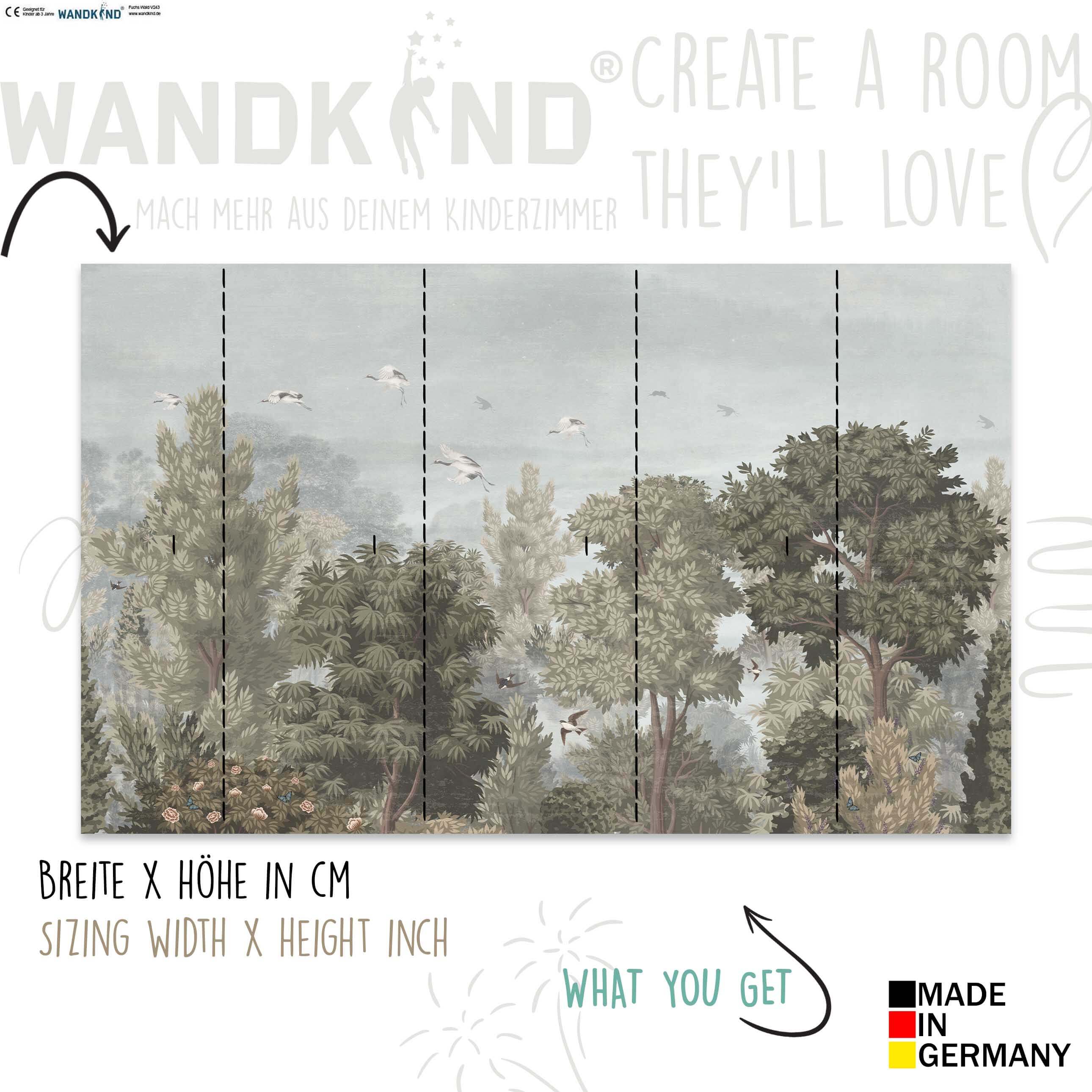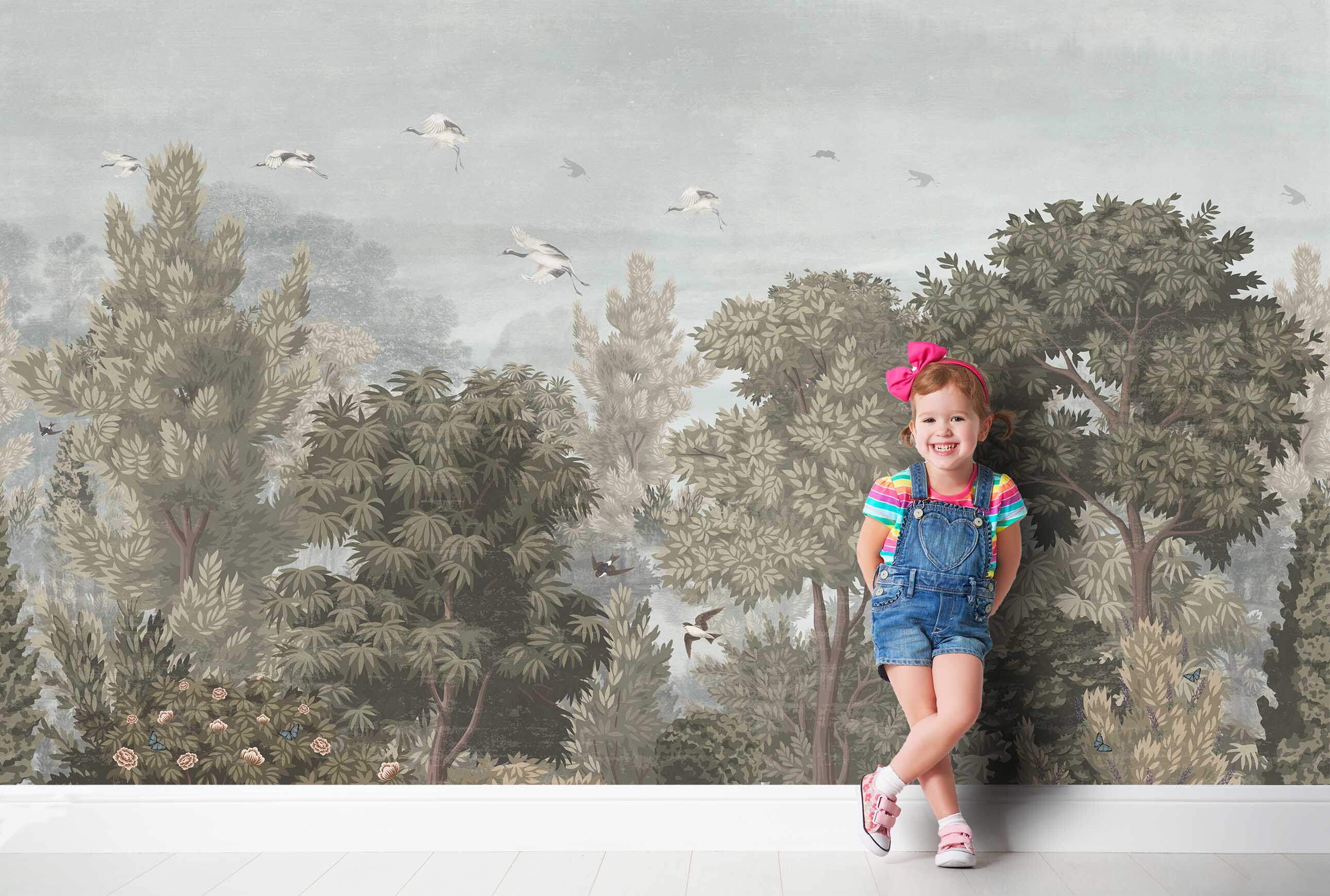 Verwandelt das Kinderzimmer eurer Lieblinge in eine beruhigende Naturkulisse, die zum Träumen einlädt. Unsere Sanfter Wald Kinderzimmer Tapete präsentiert einen malerischen Wald in soften Farben, während im Horizont Vögel umherfliegen. Diese Fototapete schafft eine entspannende Atmosphäre, in der eure Kinder zur Ruhe kommen und friedlich schlafen können.