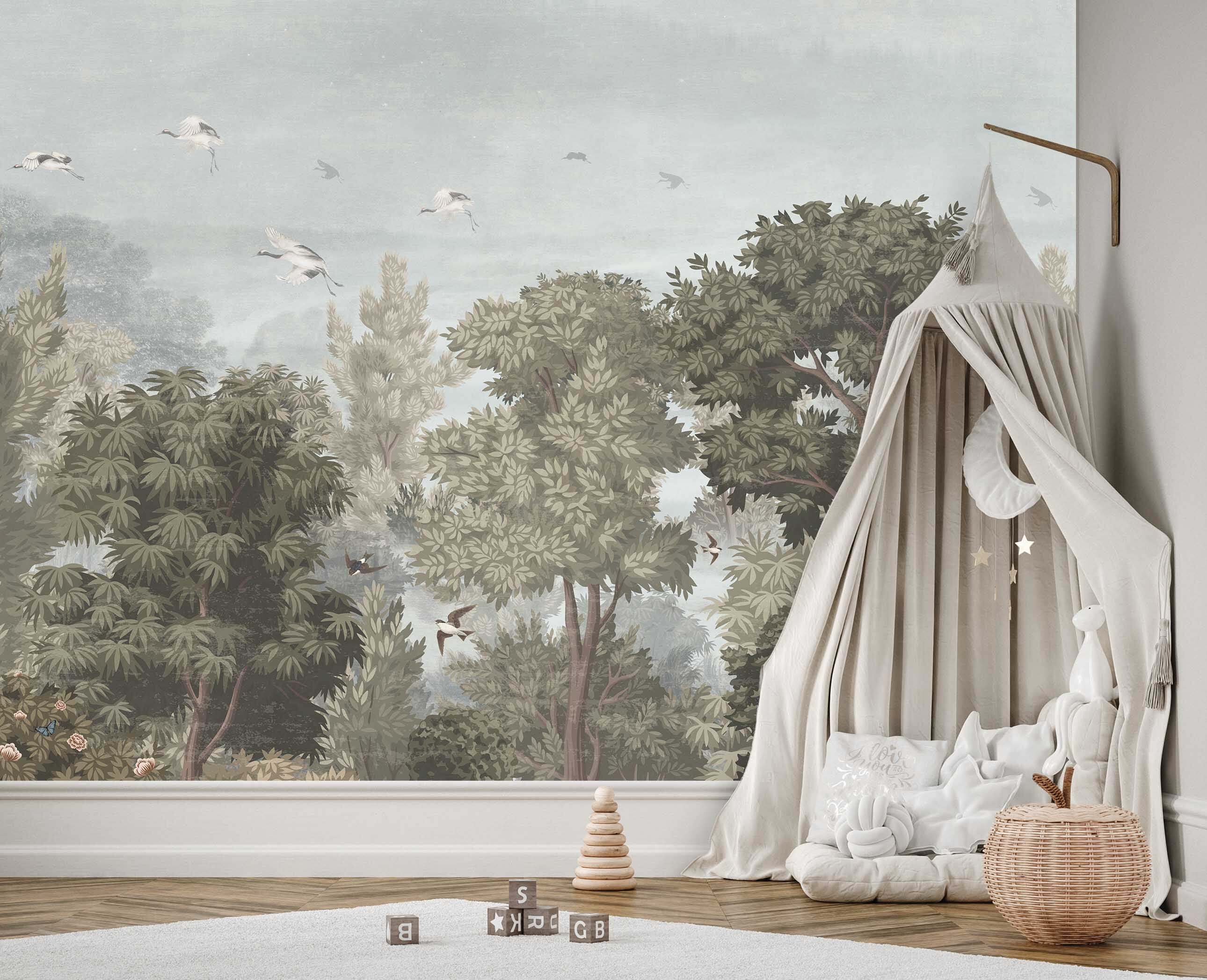 Sanfter Wald Kinderzimmer Tapete: Eine beruhigende Naturkulisse für süße Träume