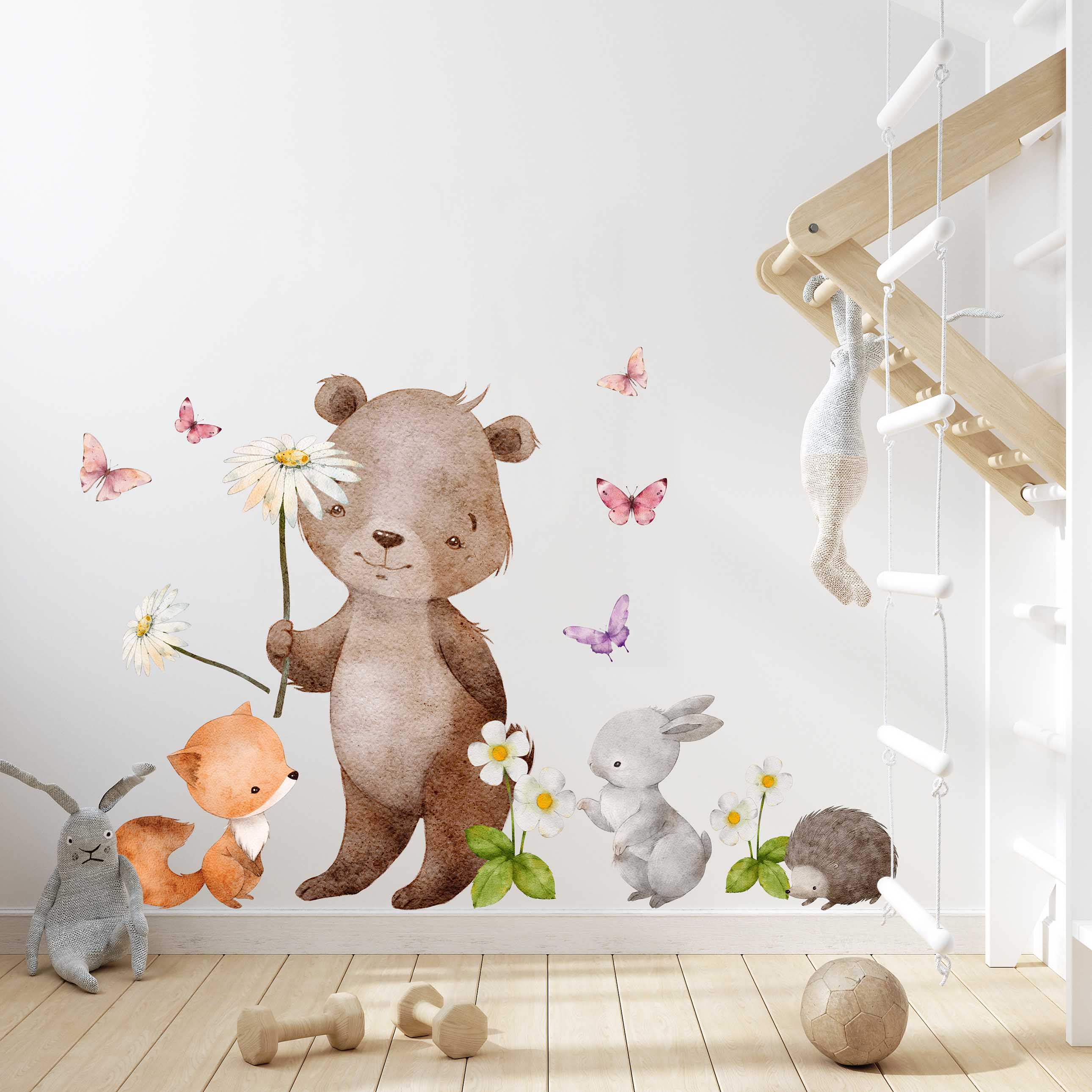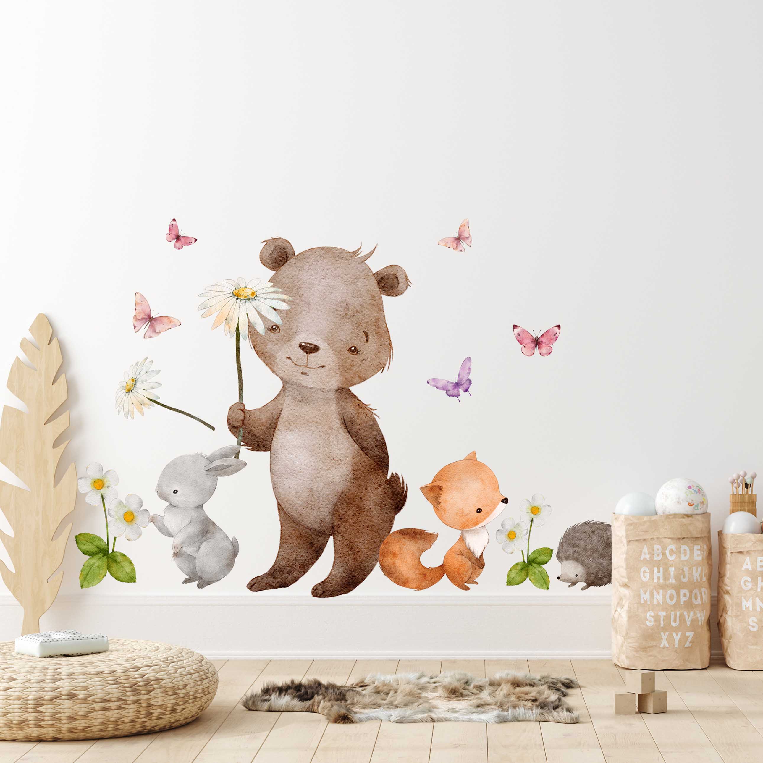 Magisches Wandtattoo: Bär mit Sonnenblume und tierischen Gefährten