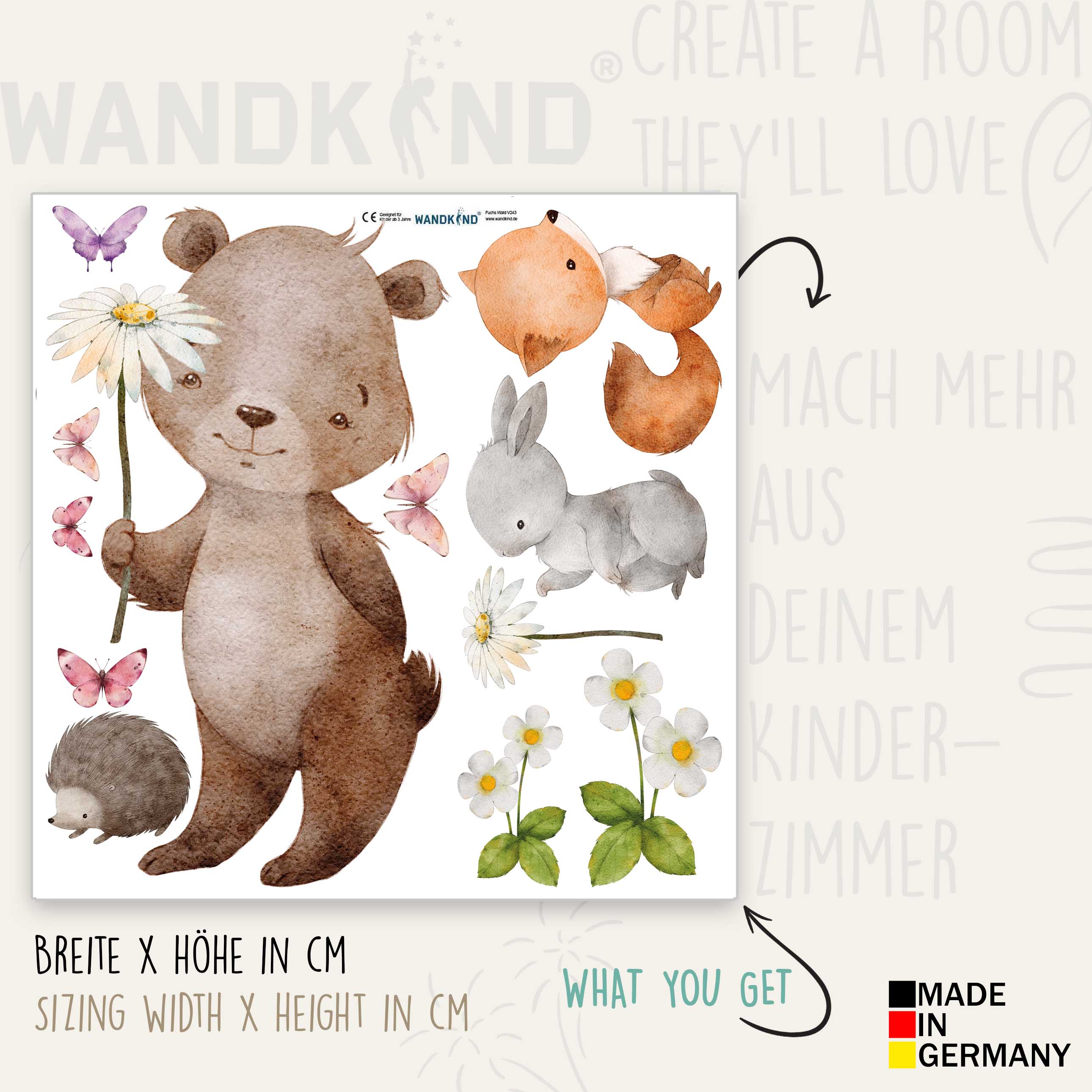 Tauche ein in die faszinierende Welt des Waldreichs mit unserem Wandtattoo! Ein majestätischer Bär, umgeben von Schmetterlingen, begleitet von einem niedlichen Fuchs, Hasen und Igel, hält stolz eine strahlende Sonnenblume in seinen Pranken.DETAILS: